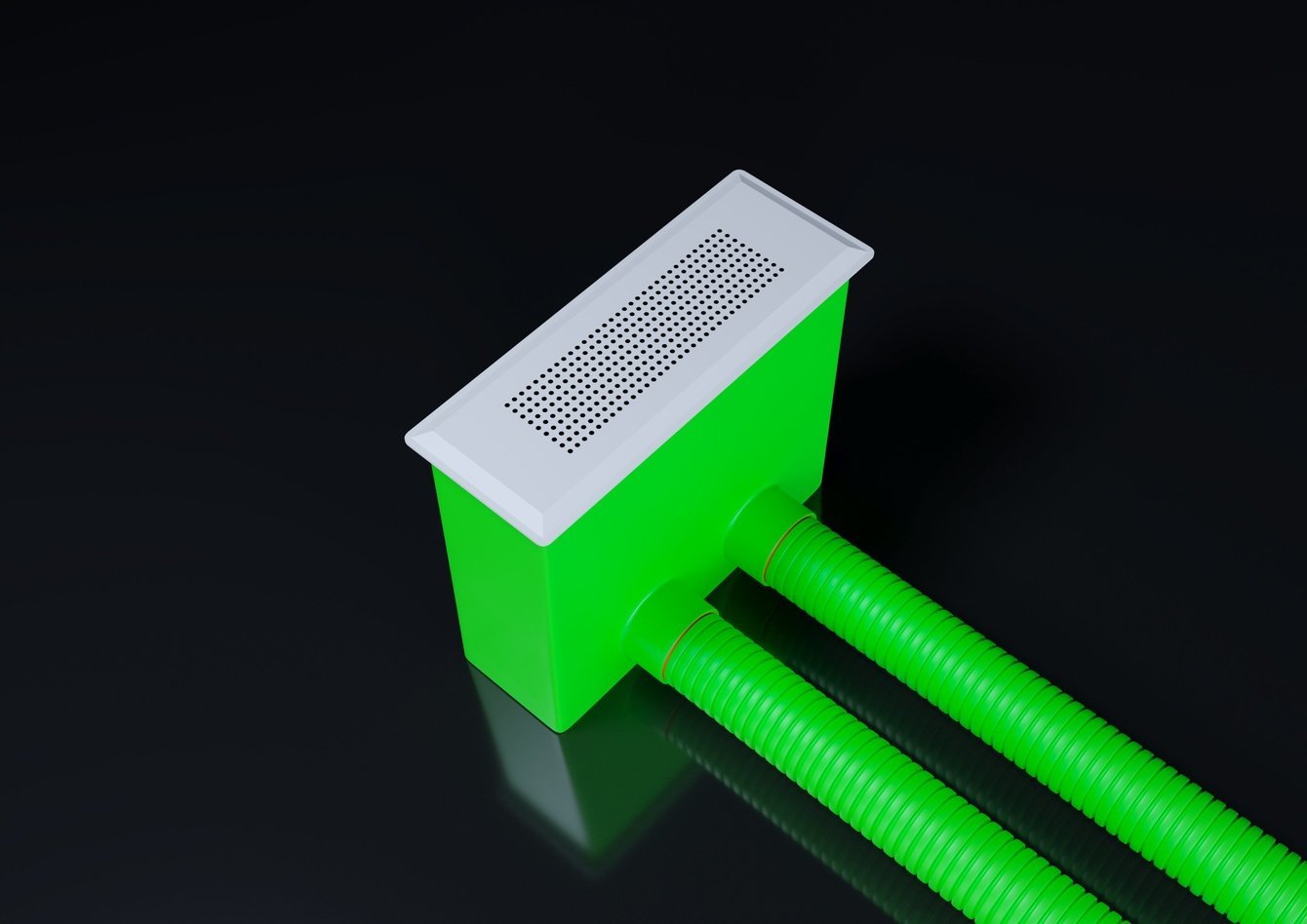 Компактная — за счет гибких (зеленых) пластиковых воздуховодов с высотой профиля всего лишь 50‐90 мм. Это позволяет проложить воздуховоды в стяжке пола или под потолком без его занижения. Воздуховоды покрыты внутри антибактериальным и антистатичным покрытием. В отличие от металлических воздуховодов им не страшна коррозия.