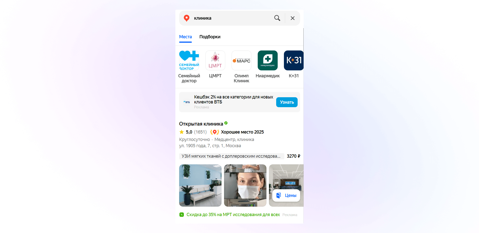 Сегодня средняя цена одного обращения в клинику через контекстную рекламу варьируется от 1000 до 10 000 рублей в зависимости от региона и направления. При этом геосервисы давно обогнали платные каналы по эффективности: в Москве и области 32% обращений в клиники приходят именно с карт против 30% из контекста. А в регионах разрыв еще больше — 38% против 17%.