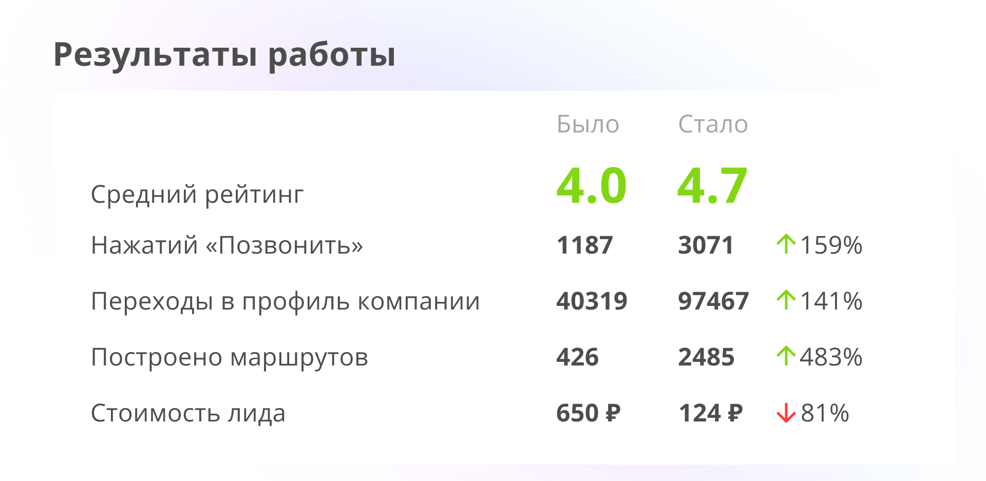 Результаты говорят сами за себя: если раньше около 35% отзывов о клинике были негативными, то после внедрения скриптов и новых процессов этот показатель снизился до 4–5%. А вместе с этим заметно вырос средний рейтинг на ключевых площадках