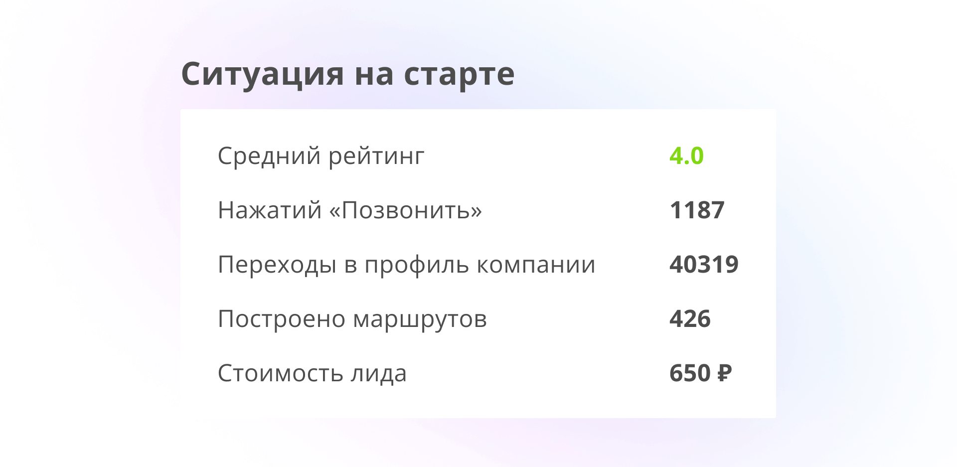 Следующим шагом стала подготовка к запуску рекламы. Мы провели детальный анализ конкурентов: изучили, кто и как продвигается на Яндекс.Картах, а также какие рекламные форматы они используют на других рейтинговых площадках.
