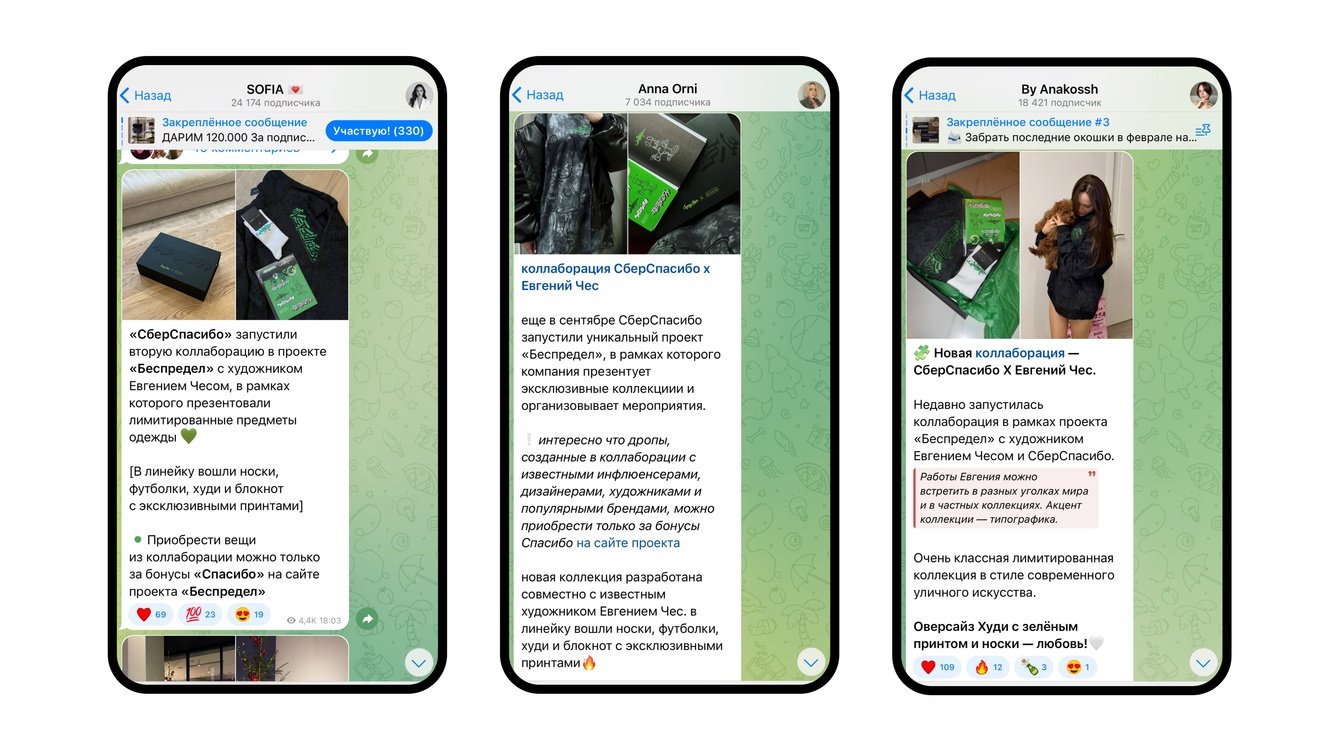 Запуск поддержали созданием Reels в VK и постом с роликом в Telegram-канале СберСпасибо. В рамках PR-активностей запустили интеграции с популярными блогерами и реализовали флешмоб в Питере, где участники гуляли по городу в капсульных футболках, попадая на фото горожан и туристов, опубликованных в социальных сетях. Кроме того, разместили объявление на Авито с футболкой из коллекции в 2,5 раза выше ее стоимости. Это привлекло внимание маркетинговых Telegram-каналов, которые осветили у себя коллаборацию.