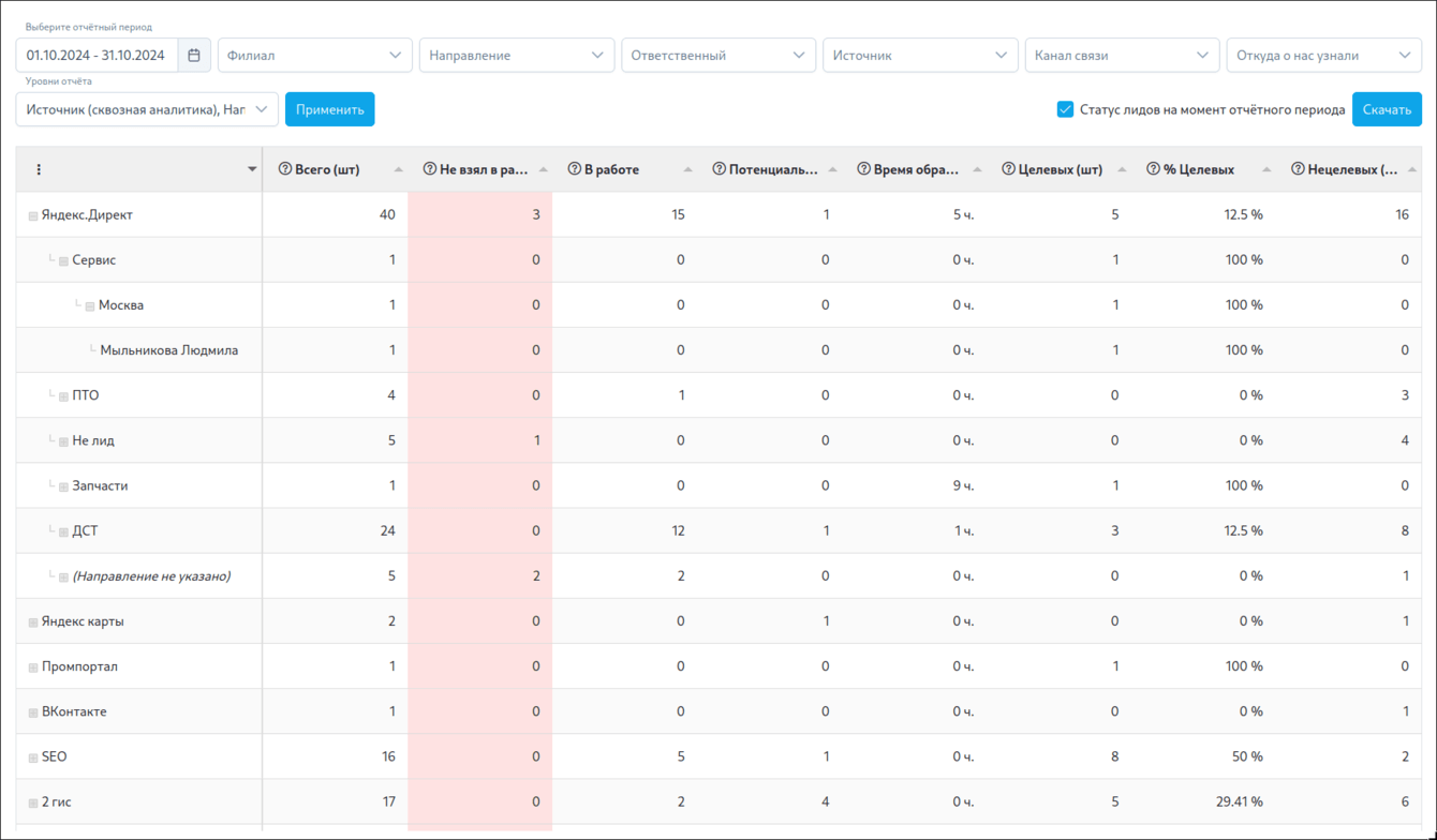 - Отчет содержит показатели "Целевых" и "Нецелевых" лидов, что позволяет анализировать, насколько хорошо источники приводят потенциальных клиентов, которые соответствуют целевым критериям компании.