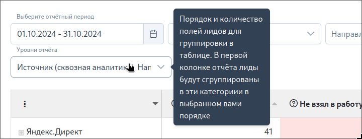 - Уровни отчёта - влияет на порядок и количество группировок в таблице. Можно выбрать как сразу все группировки, так и какую-то одну. Более конкретно: можно сгруппировать лиды, например сначала по направлению, а потом по филиалу, или наоборот, сначала по филиалу, или только по направлению, либо вообще просто по менеджеру.