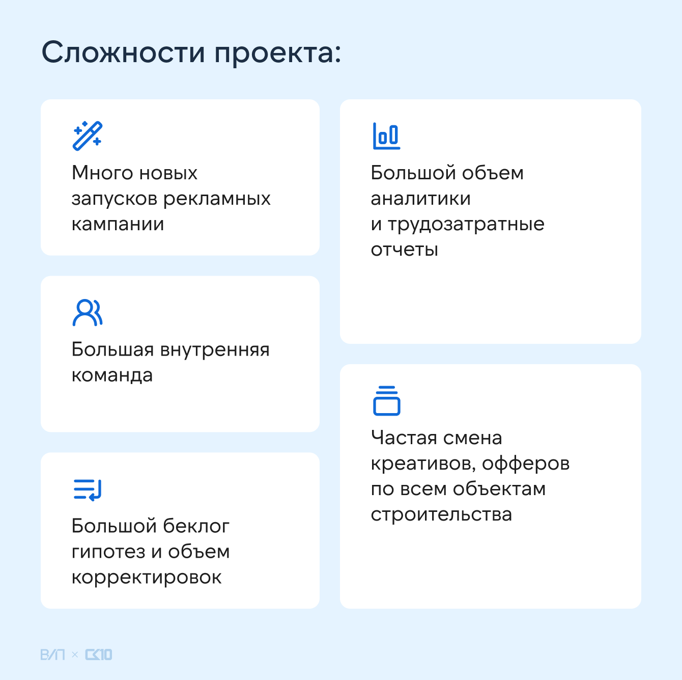 При прошлых запусках из контекстной рекламы клиент получал менее 100 лидов в месяц и качественная заявка превышала 50 000 рублей. На момент обращения у застройщика было 5 объектов строительства. В течение года список скорректировался.