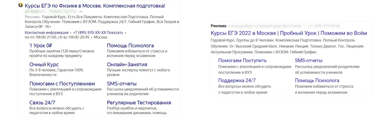 Функционал расширений Яндекс.Директ и Google Ads мы задействовали по-максимуму, чтобы раскрыть в объявлениях все возможные преимущества компании.