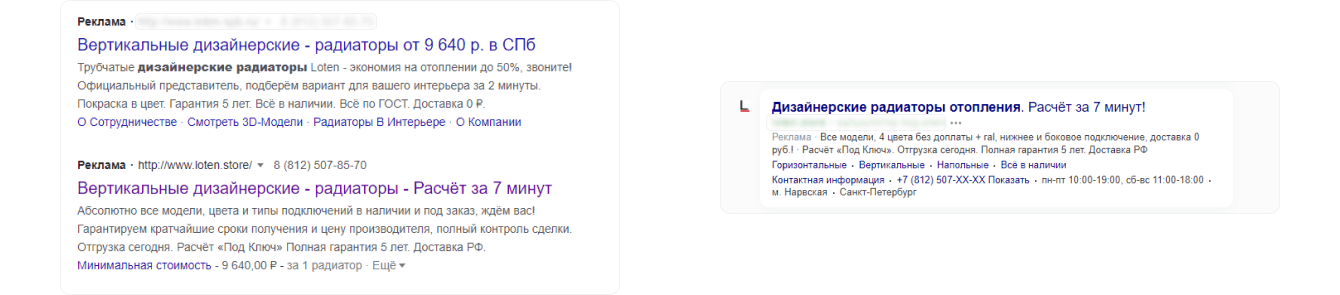 Для наиболее быстрого роста эффективности рекламы сразу же было проведено А/B-тестирование объявлений как в Яндекс, так и в Google. По итогу тестирования было выявлено, что наибольшую результативность (как конверсионность, так и кликабельность) демонстрируют объявления с использованием релевантного первого заголовка + дополнительного заголовка с указанием ориентировочной стартовой цены продукции.