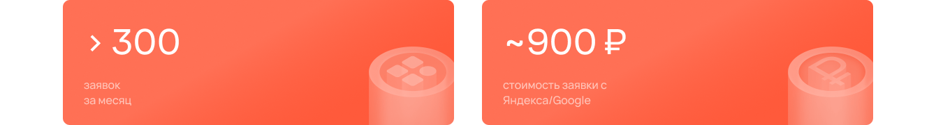 Несмотря на то, что на Google держался расход в 2 раза меньше, чем на Яндексе, из-за значительно меньшего количества трафика, стоимость заявки на обеих площадках была приблизительно равна и составила 900 рублей.