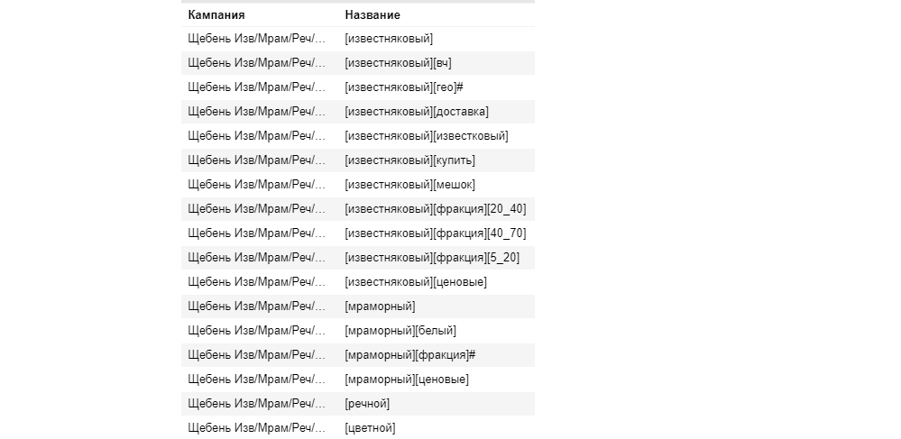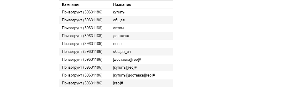 Уделяем особое внимание гео-запросам: делаем группы объявлений по шаблонам со всевозможными вариациями гео по Московской области (брались только целевые запросы: «купить», «доставка» и т. д.).