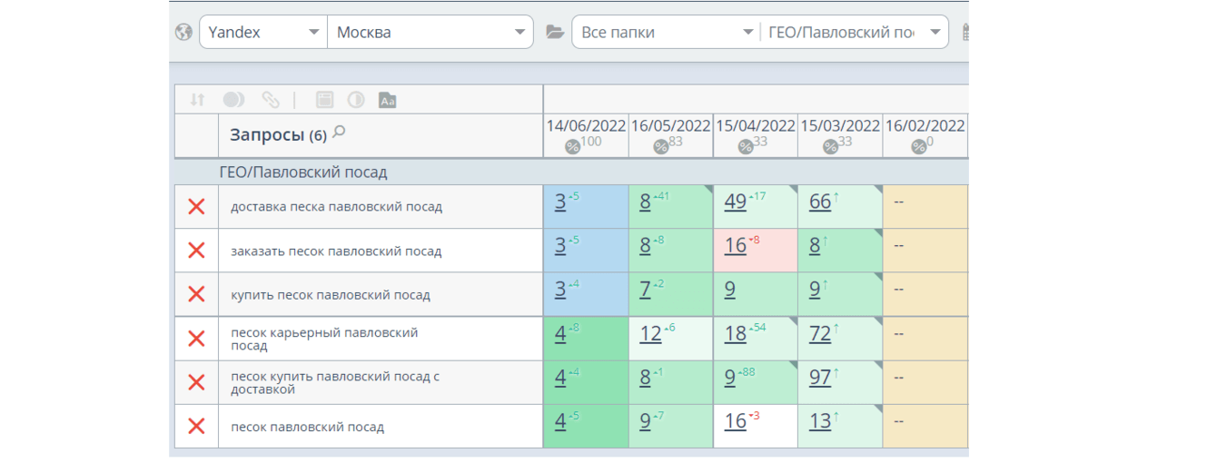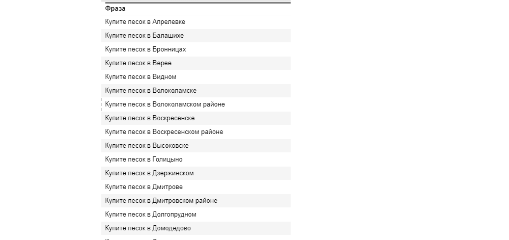 После сбора и анализа семантического ядра мы предложили создать страницы под коммерческие гео-запросы вида «купить песок в Павловском Посаде», «заказать песок в Барыбино» и т. д., привязанные к конкретным городам Московской области.