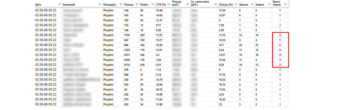 Отдельные рекламные кампании приносят до 40+ лидов в неделю.