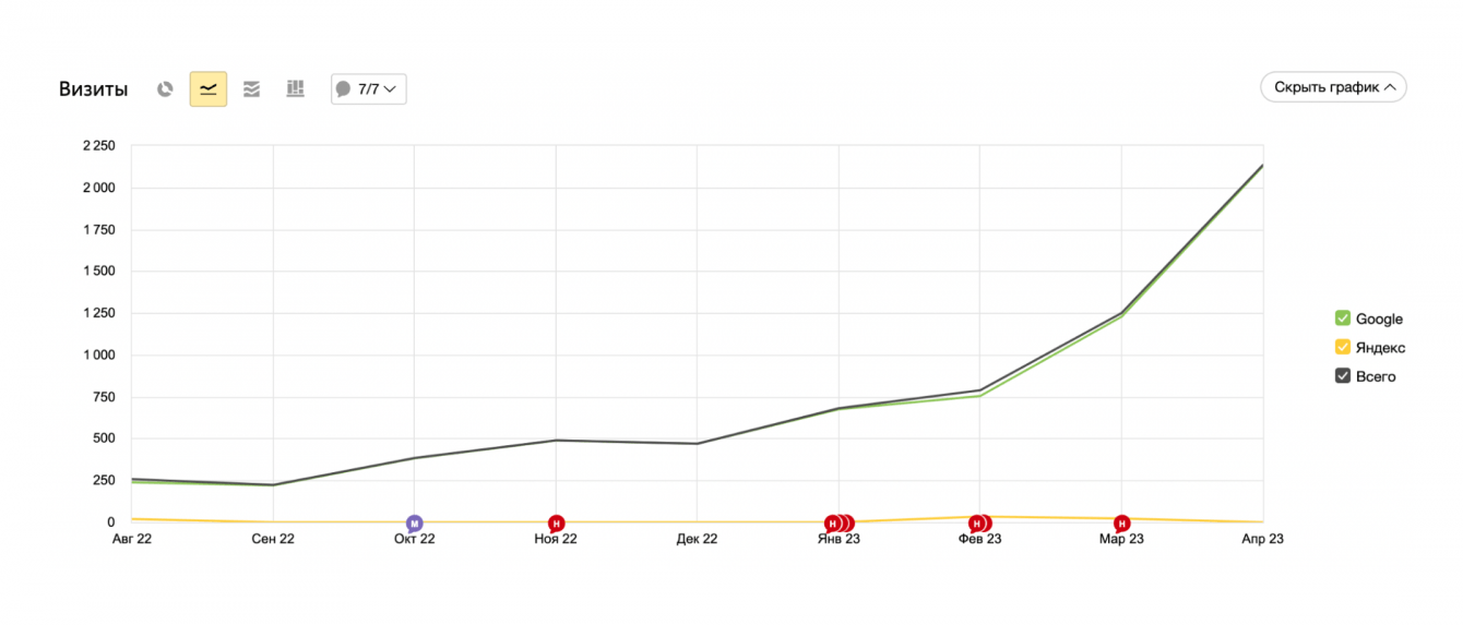 В апреле трафик в обеих поисковых системах — 2 128. С начала работ трафик вырос в 5,5 раз.