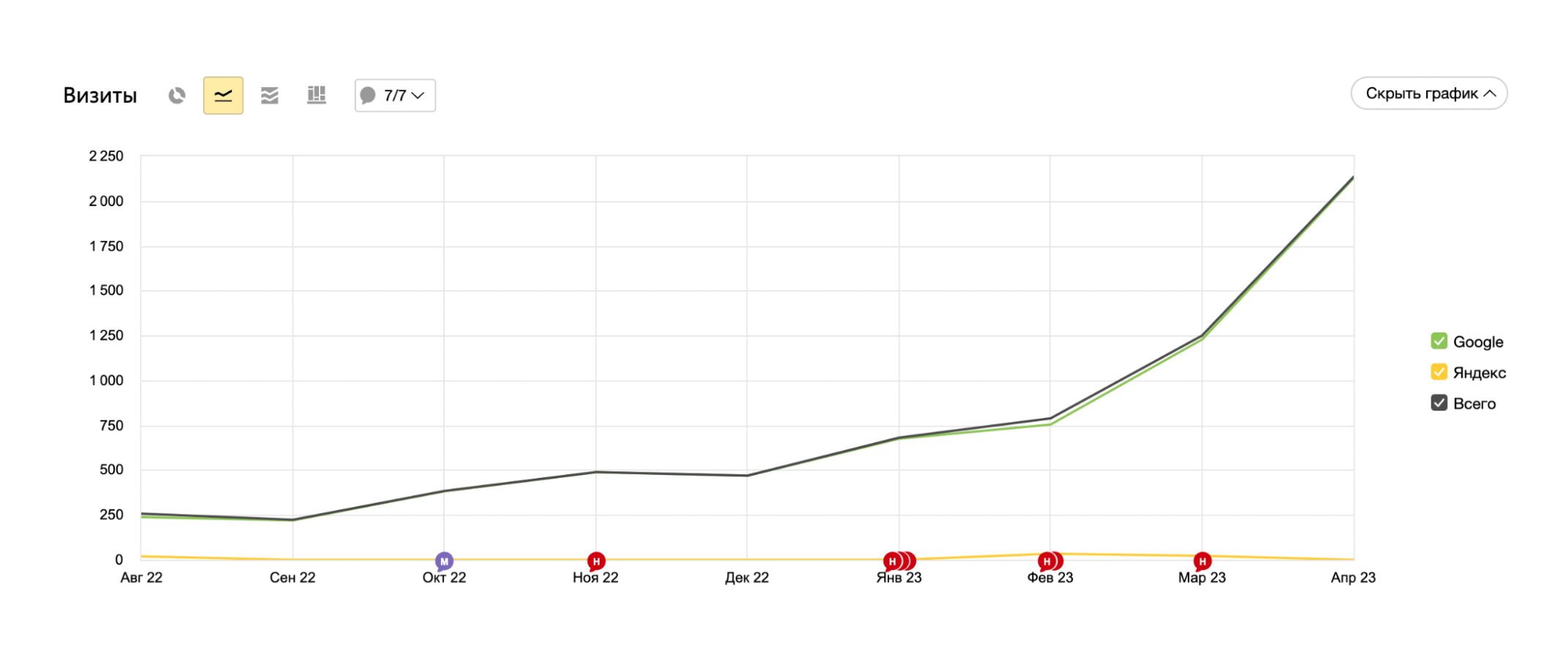 В апреле трафик в обеих поисковых системах — 2 128. С начала работ трафик вырос в 5,5 раз.