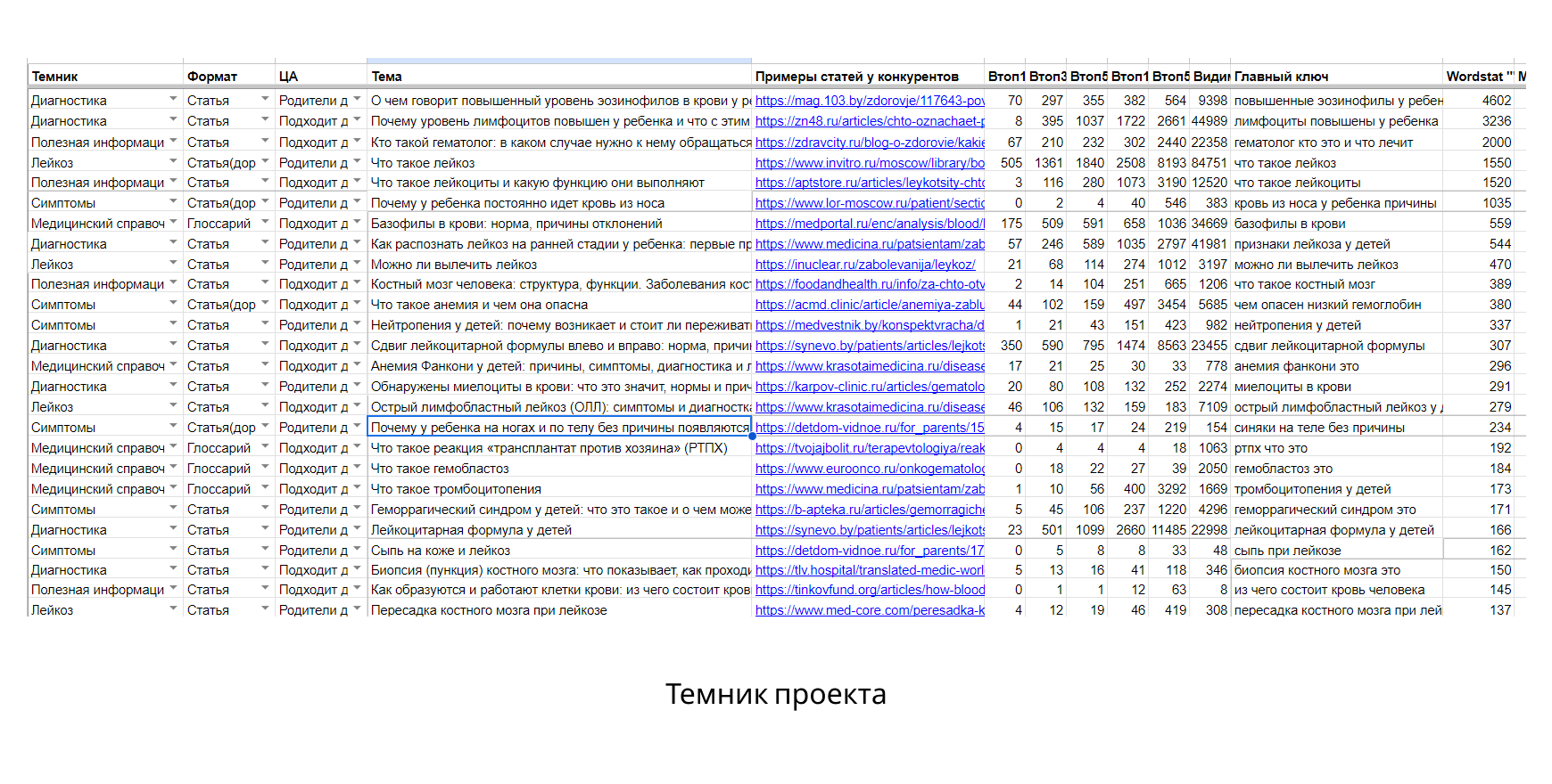 Сначала нужно было настроить коммуникацию с фондом и совместиться по пониманию задачи. И первая сложность, с которой мы столкнулись — выбор тем. Выяснилось, что многие темы, которые фонд считает важными, пользователи не ищут в интернете — на них нет поискового спроса или он низкий. А многие частотные темы казались клиенту слишком общими и не связанными с лейкозом напрямую. Такими, например, были статьи об изменениях разных показателей крови.