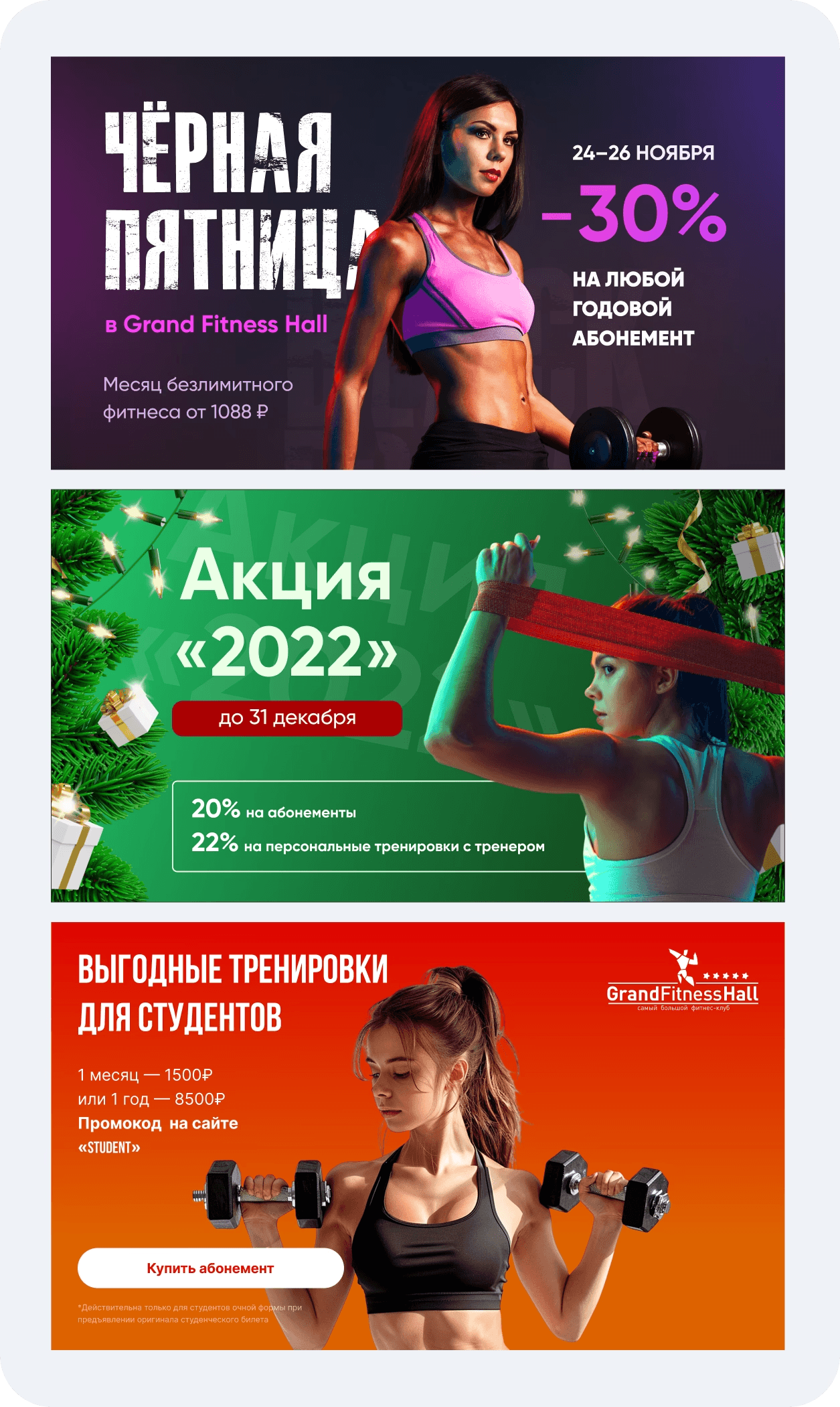 Также решили отказаться от всей брендовой рекламы, так как работу продолжили с половиной бюджета и уже не могли распылять часть денег на узнаваемость. Нужно было сфокусироваться на рекламе, которая точно приносит результат, поэтому упор сделали на рекламу по направлениям фитнес-клуба и специальные предложения.