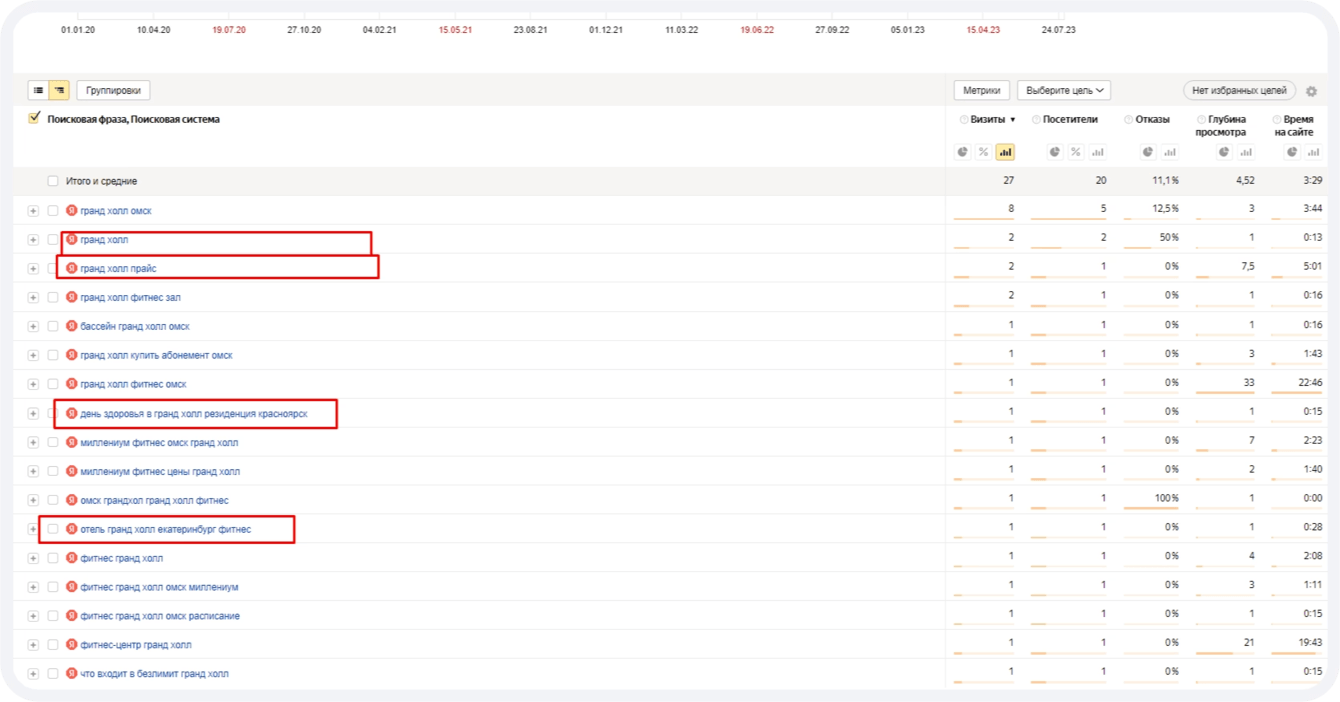 Из интересного, столкнулись с тем, что Яндекс стал подмешивать в семантику запросы «гранд холл» и похожие на него запросы. Казалось бы семантика похожа на «гранд фитнес холл», но на поиске люди искали совсем другой бизнес из другого города, который даже не связан с нишей фитнеса.