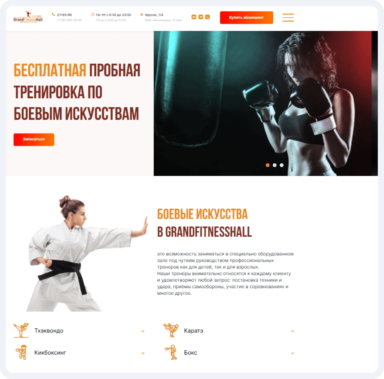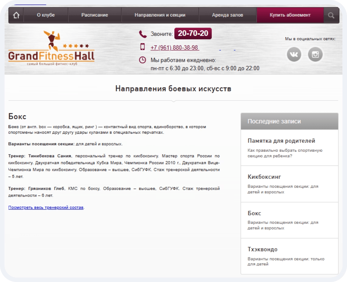 Новый сайт позволил разбить кампании и сегментировать их под разные направления: бокс, общий зал, женский зал, йога, персональные тренировки. И вести трафик уже на проработанные страницы, где есть форма заявки. Раньше страницы направлений выглядели просто как информационный блок – без призыва к действию.