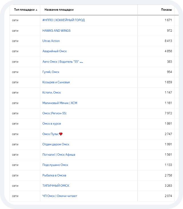 Трафика с ТГ-каналов приходит не так много, так как в Омске ограниченное количество крупных каналов для рекламы. Плюс не все из них подключены к монетизации через РСЯ – а значит рекламу Яндекс в них размещать не может.