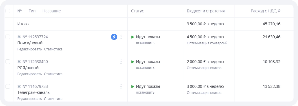 Все кампании по направлениям фитнес-клуба объединили в ЕПК. Единая перфоманс-кампания ― инструмент Яндекса, который сочетает несколько типов рекламных кампаний: поиск, РСЯ, динамический поиск и смарт-баннеры.