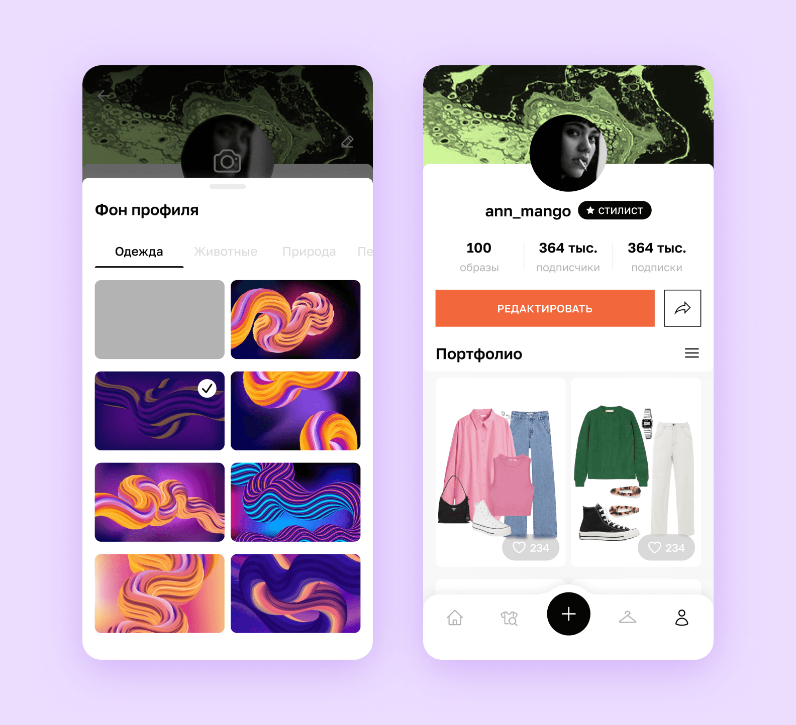 2️⃣ Светло-голубой цвет фона оттеняет белые плашки с образами и отлично подходит для просмотра изображений. Оранжевый добавляет в интерфейс уют и тепло, а темные кнопки создают контраст и задают более серьезный тон.