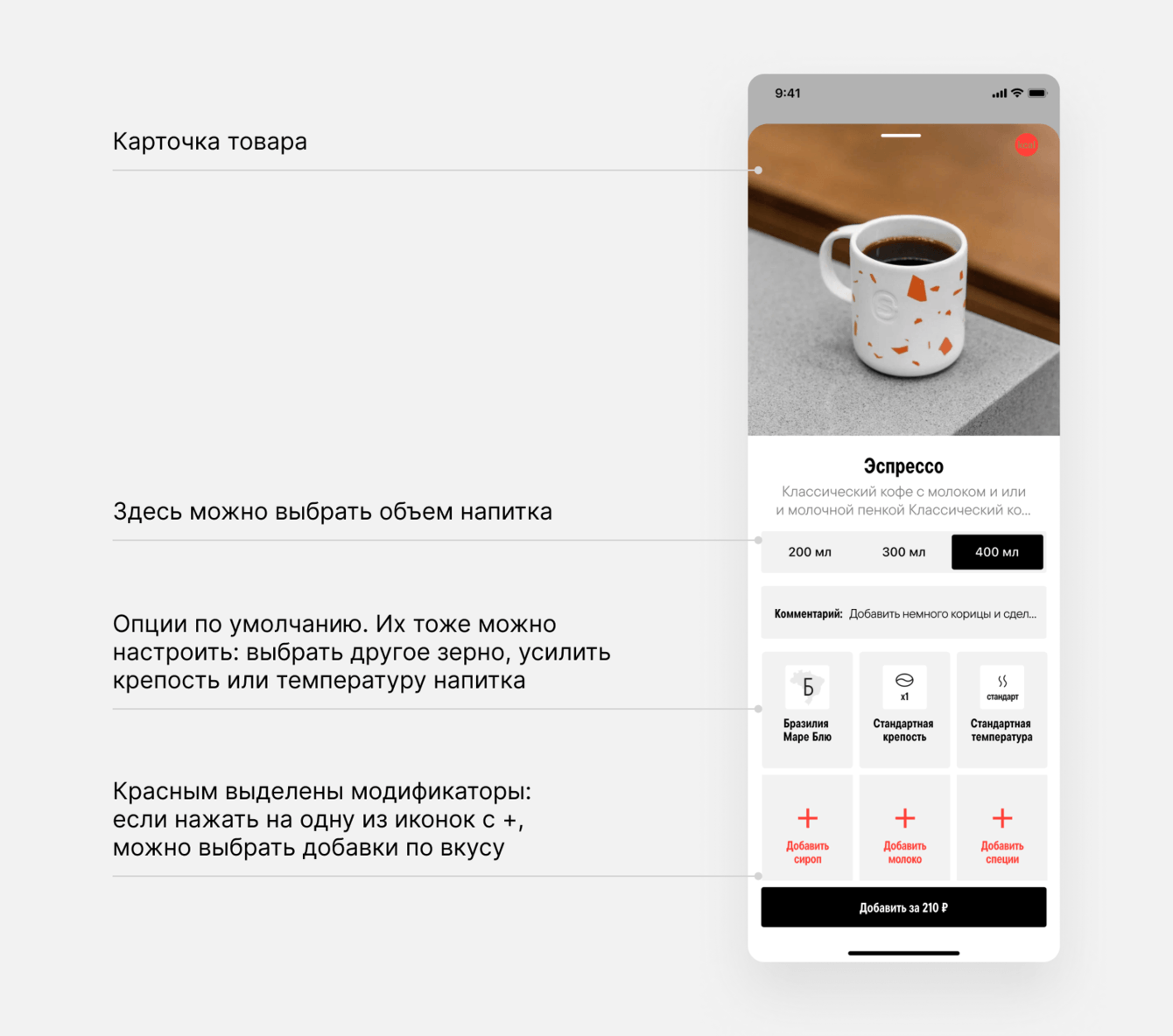Одна из фишек приложения — полная кастомизация напитка. То есть, можно заказать кофе покрепче или более молочный, на альтернативном молоке, с сиропом и другими добавками по вкусу. У каждого напитка в приложении свои настраиваемые параметры, или модификаторы.