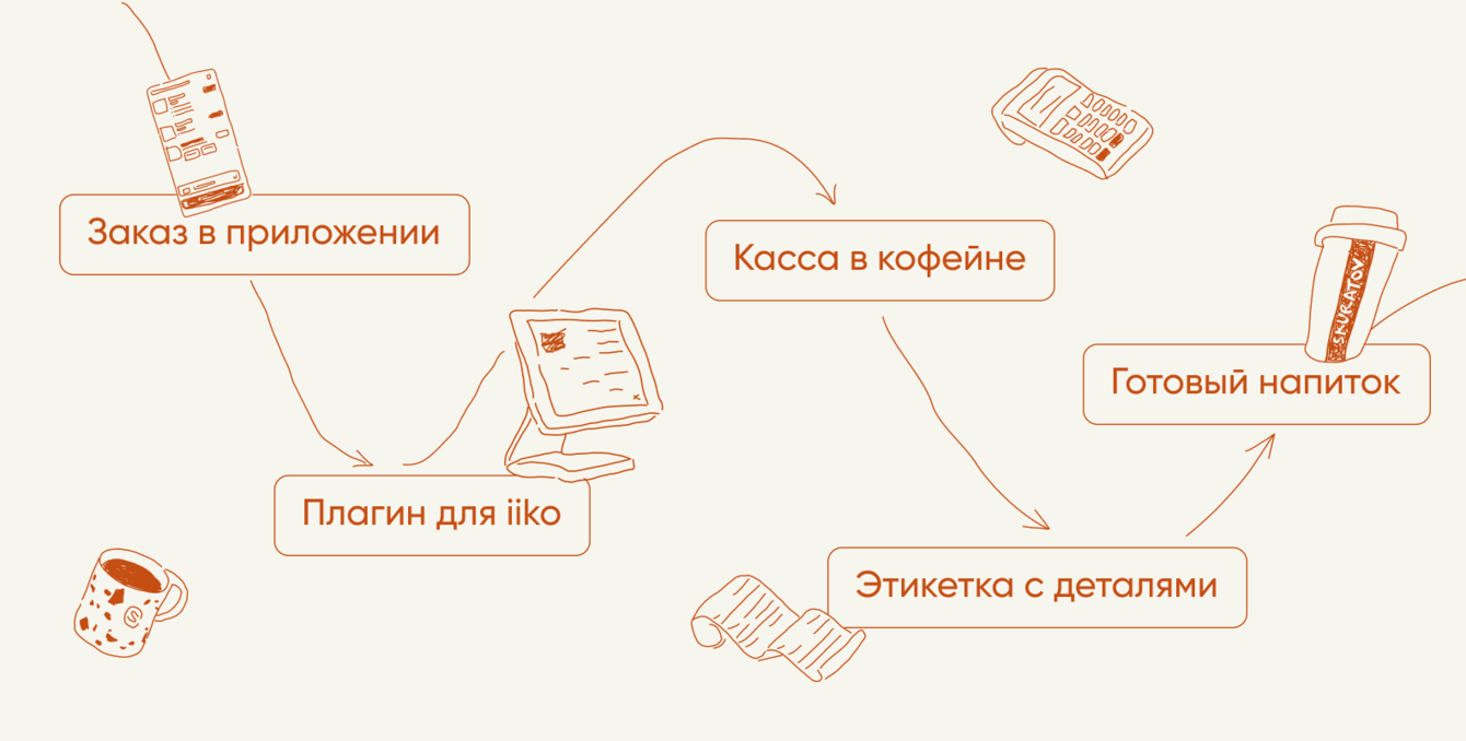 Когда гость делает заказ через приложение, данные передаются на кассу кофейни через специальный плагин для iiko. Прямого взаимодействия между приложением и кассой нет из-за технических особенностей, поэтому плагин выполняет роль посредника между базой данных приложения и кассовой системой iiko.