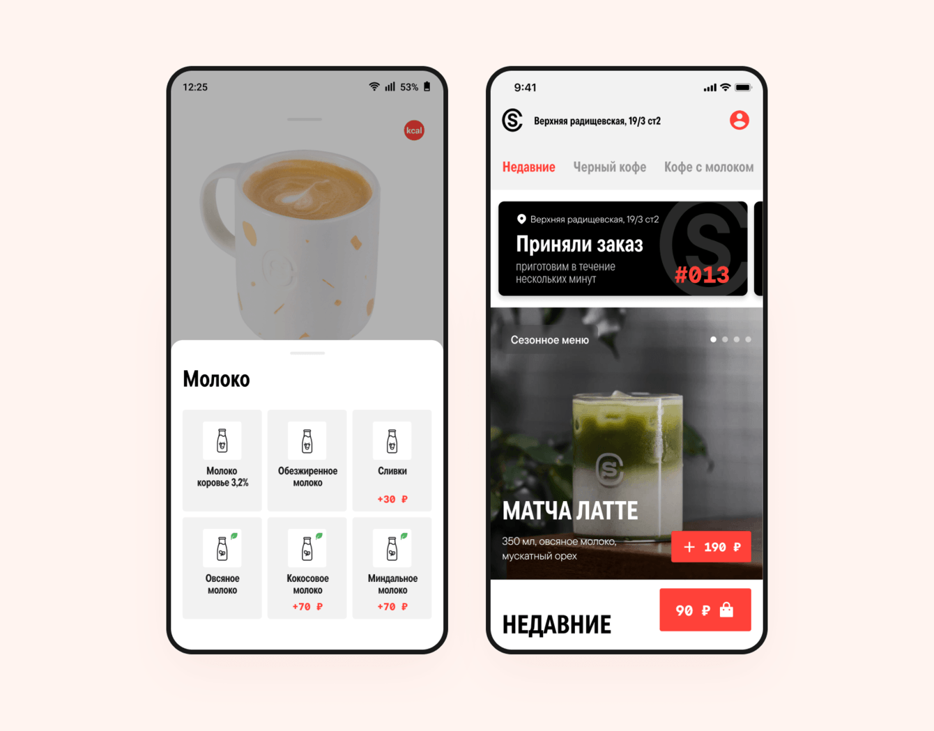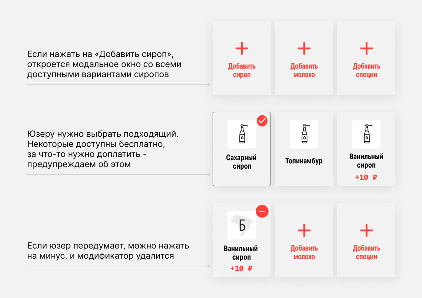 Наши UI/UX дизайнеры придумали, как сделать кастомизацию напитка максимально удобной и быстрой — чтобы юзеру не пришлось листать много экранов. Реализовали её через вложенность. Это когда одни элементы скрыты или зависят от других, и пользователь раскрывает их по мере необходимости.