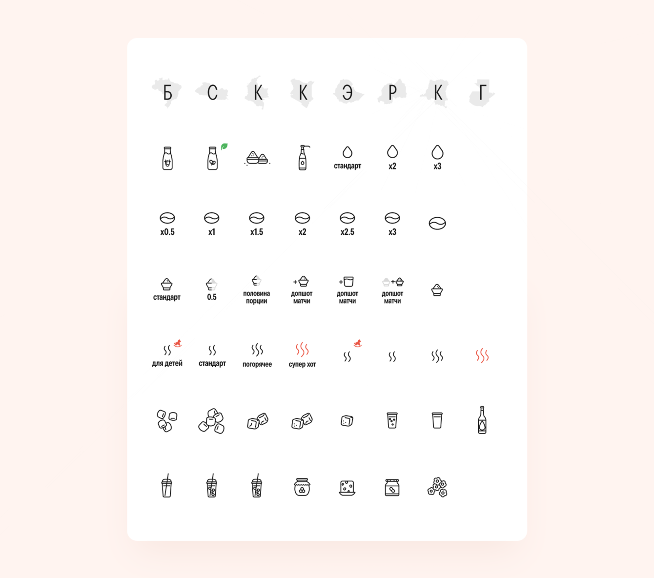 Вместе с заказчиками придумывали стиль иконок. Здесь это не просто красивые картинки: они являются частью навигации и помогают гостю понять, что значит тот или иной модификатор.