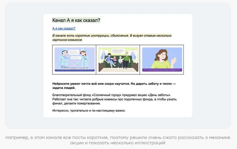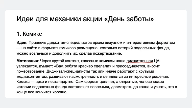 На созвоне клиент рассказал, как они обычно продвигают акцию «День заботы». Мы предложили свои идеи о том, какой контент и на каких площадках можно попробовать разместить в этом году.
