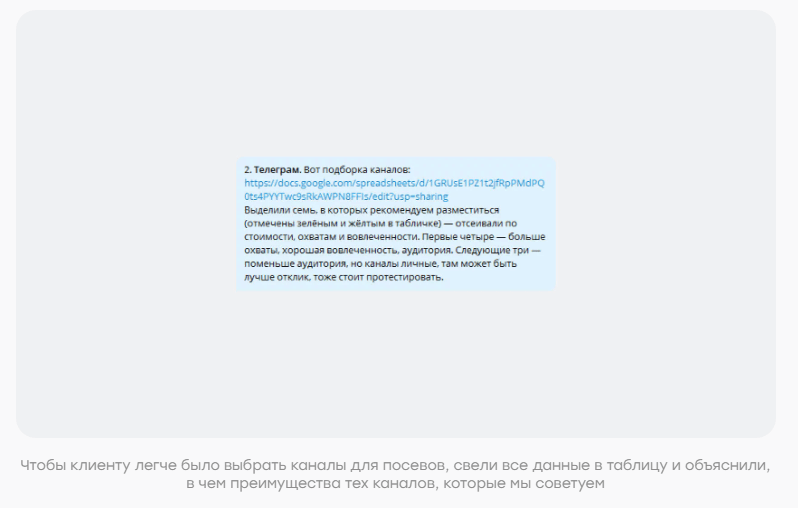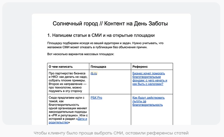 Подобрали два варианта для продвижения: СМИ и открытые площадки, Телеграм. Для каждого подробно расписали: что сделаем, сколько это будет стоить, как будем действовать при форс-мажоре — например, если СМИ откажут нам в публикации.