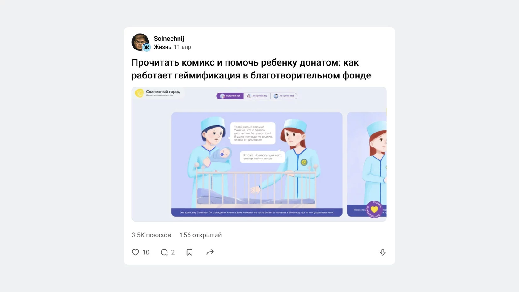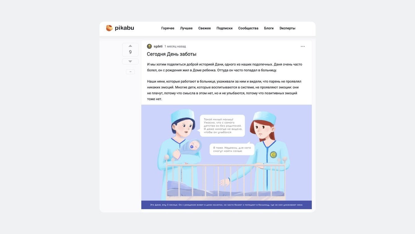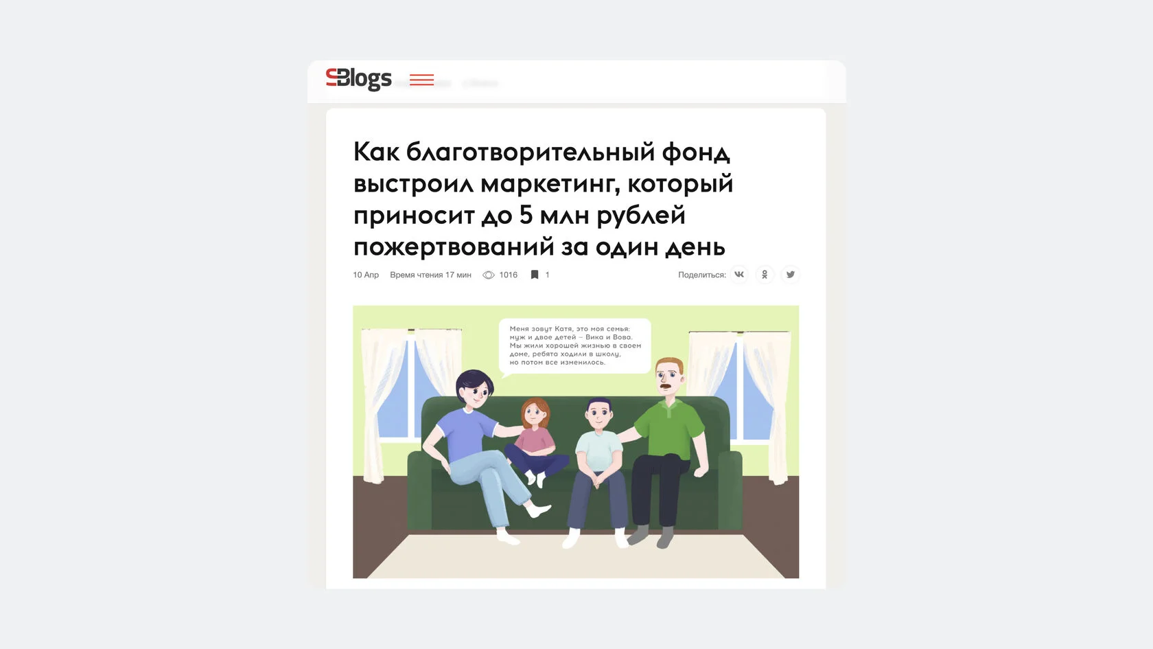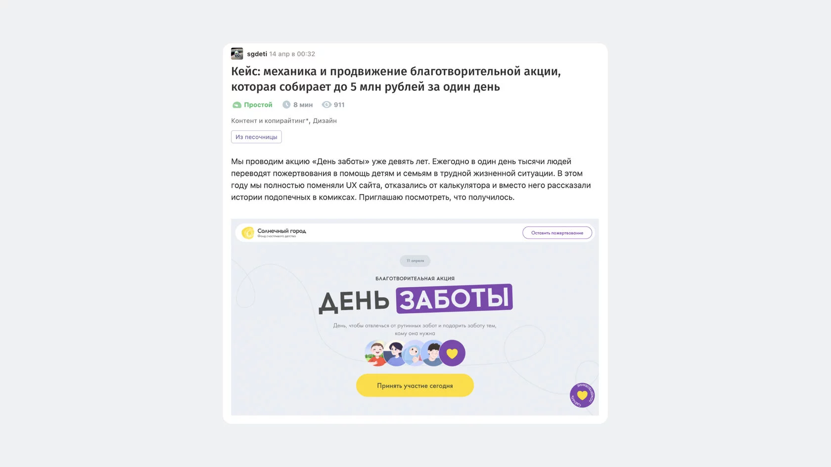 vc.ru. Материалы площадки читают предприниматели, стартаперы и диджитал-специалисты. Здесь хорошо заходят хайповые темы, а чтобы статью прочитали, нужно зацепить внимание заголовком и обложкой. Мы выбрали заголовок, который раскрывает суть статьи, и добавили немного эмоций, а на обложку разместили иллюстрацию с улыбчивым малышом. В статье рассказали, что за акция «День заботы» и как у фонда получается продвигать ее без давления.