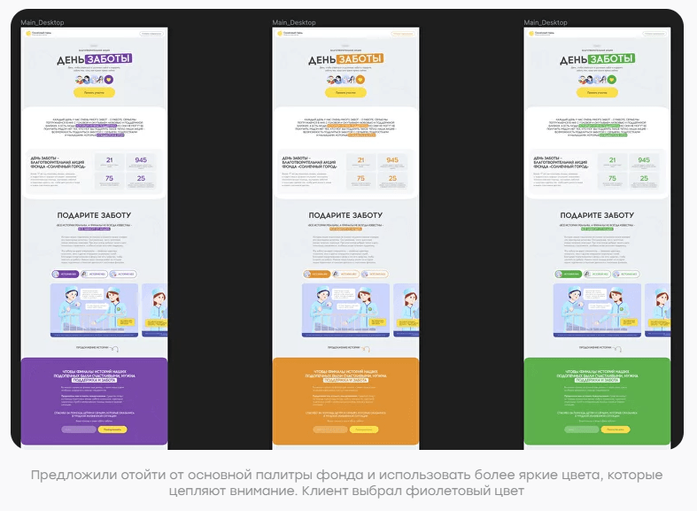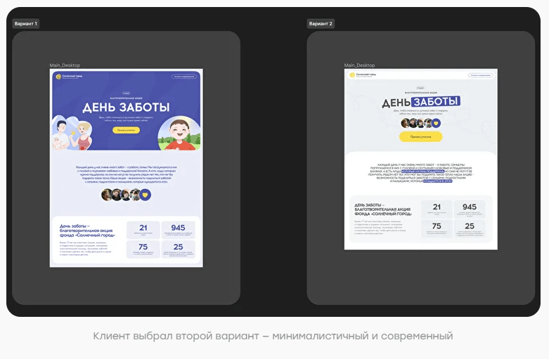 Собрали лендинг. Придумали и оформили в Фигме два варианта концепта дизайна. По утвержденному концепту сделали три варианта макета в разной цветовой гамме. Заверстали лендинг на Тильде и передали клиенту. Всю работу по лендингу — от идеи до верстки — выполнили за два месяца.