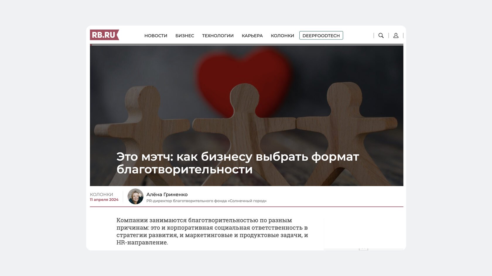 RB.ru. Аудитория на площадке бизнесовая, поэтому в статье решили рассказать о том, как бизнесу выбрать подходящий формат для благотворительности. Вытащили основные возражения, которые есть у компаний, и показали, как их отрабатывает «Солнечный Город». Привели примеры того, как благотворительность устроена у известных брендов вроде Ozon и Сбера.