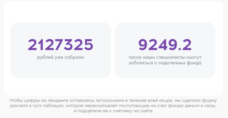 Со временем калькулятор стал неактуальным, это было видно по сумме сборов и метрике — взносов становилось всё меньше. Именно поэтому команда фонда обратилась к нам за помощью — нужно было придумать новую механику для сбора средств для лендинга акции, а еще помочь с продвижением на разных площадках.