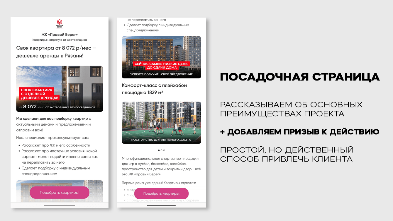Мы сделали отдельную страницу, на которой призывали сделать только одно действие: оставить номер для того, чтобы мы сделали специальную подборку квартир.