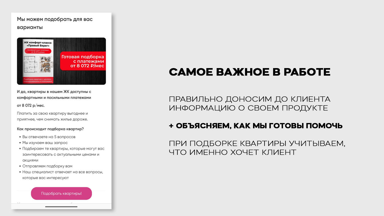 Мы сделали шаг вперёд и разработали своё специальное предложение — мы составляли для клиентов подборки планировок с ценами и помогали разобраться с видами ипотек, которые помогут сэкономить деньги нашим клиентам.