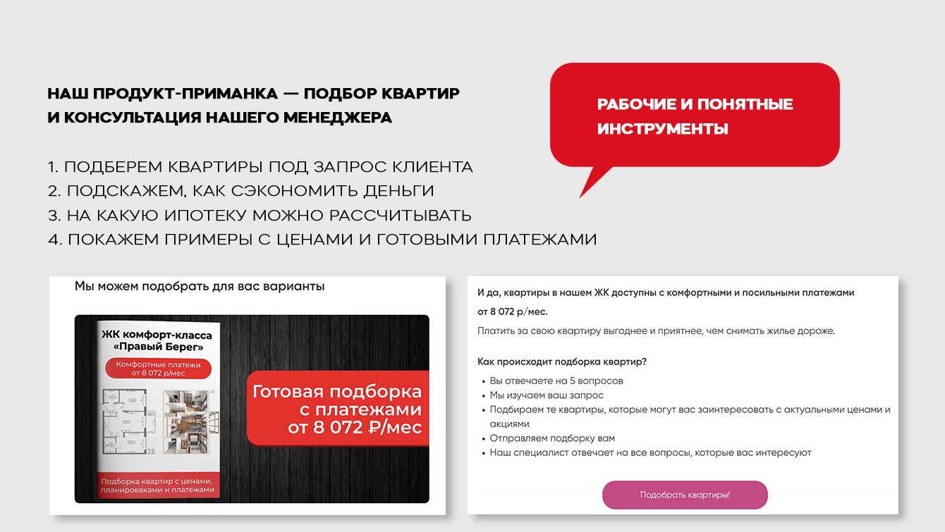 1. Разработали продукт-приманку от застройщика, на который привлекали заявки