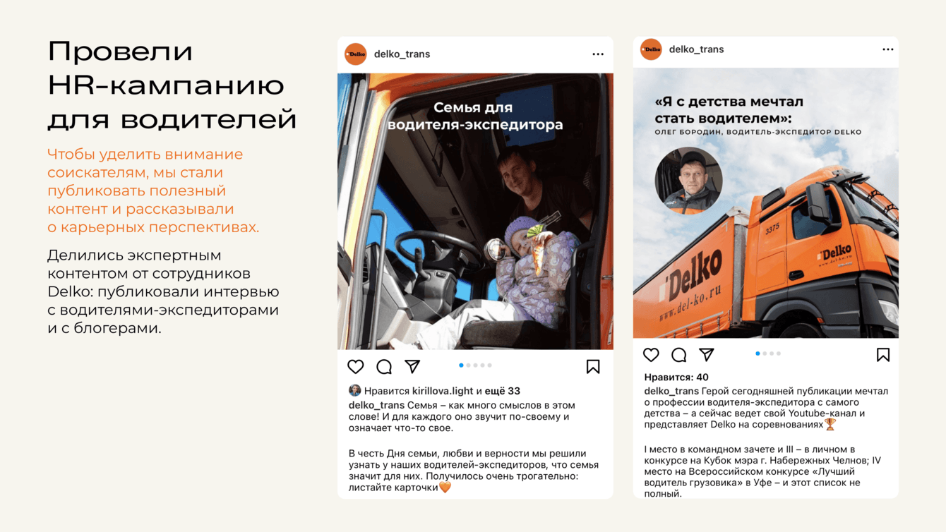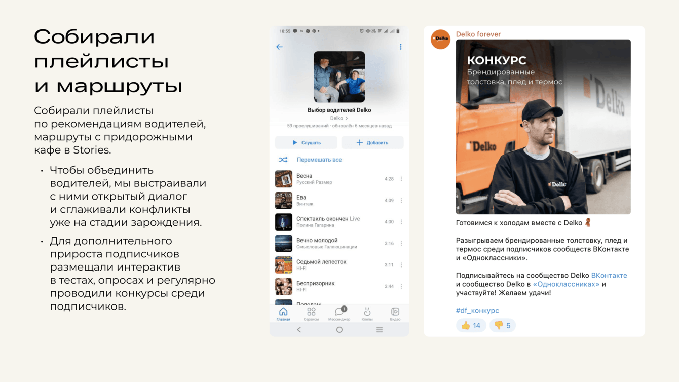 • Делились экспертным контентом от сотрудников Delko: публиковали интервью с водителями-экспедиторами и с блогерами, собирали плейлисты по рекомендациям водителей, маршруты с придорожными кафе в Stories.