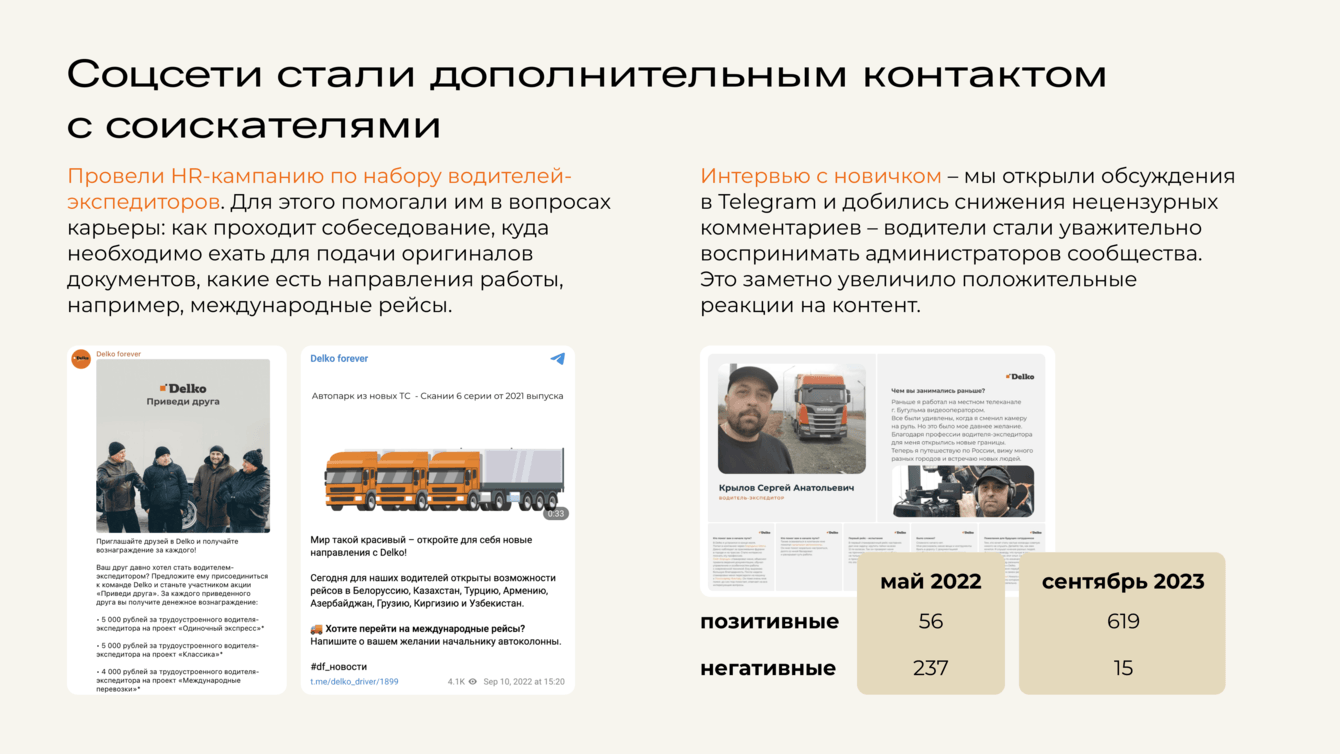 • Провели HR-кампанию по набору водителей-экспедиторов. Для этого помогали им в вопросах карьеры: как проходит собеседование, куда необходимо ехать для подачи оригиналов документов, какие есть направления работы, например, международные рейсы.