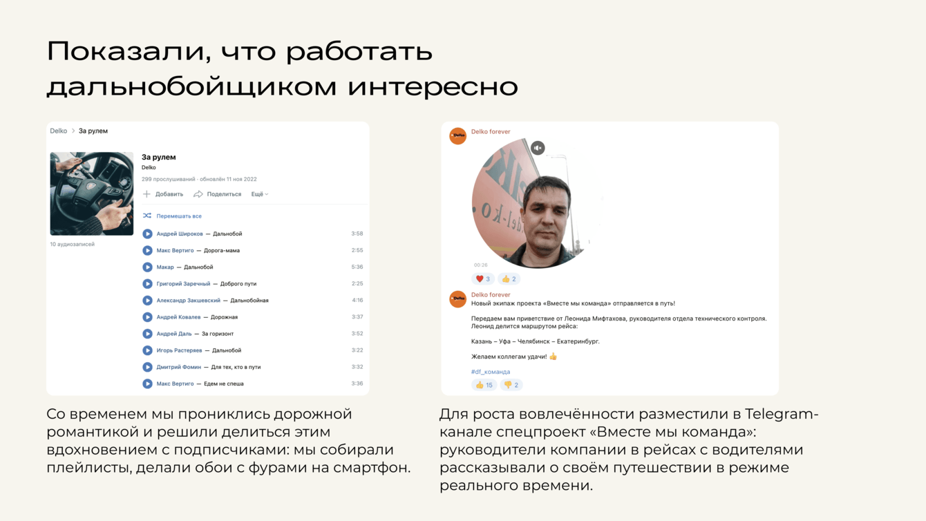 • Для роста вовлечённости разместили в Telegram-канале спецпроект «Вместе мы команда»: руководители компании в рейсах с водителями рассказывали о своём путешествии в режиме реального времени.