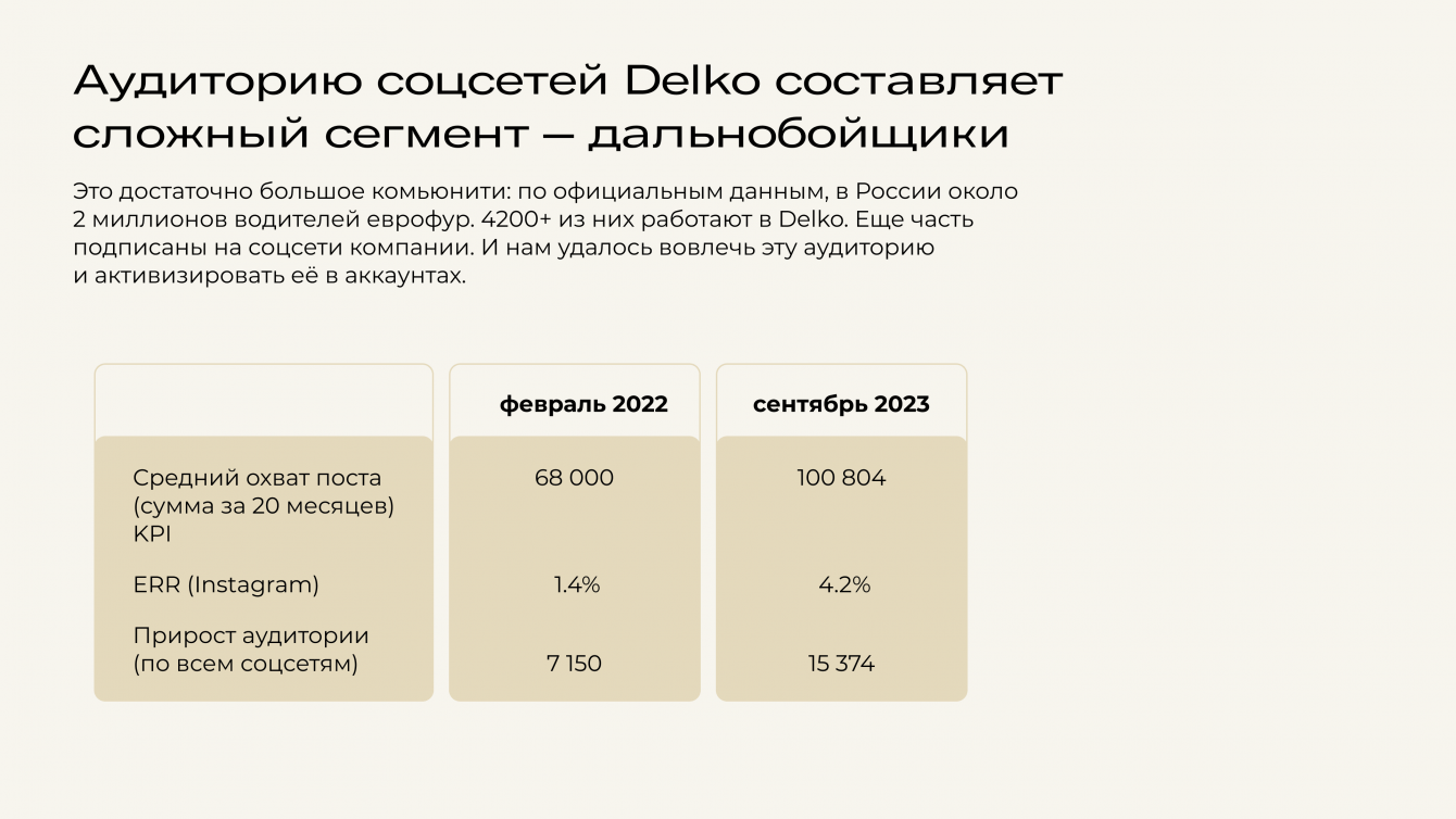 Аудиторию соцсетей Delko составляет сложный сегмент – дальнобойщики. Это достаточно большое комьюнити: по официальным данным, в России около 2 миллионов водителей еврофур. 4200+ из них работают в Delko. Еще часть подписаны на соцсети компании.