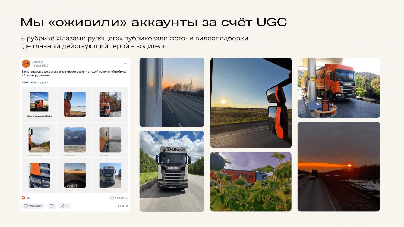 • Мы «оживили» аккаунты за счёт UGC. Если делиться полезным контентом, в него важно интегрировать людей из команды Delko: в формате интервью они готовы рассказать о работе изнутри. Контент с «героем» оживляет и вовлекает аудиторию, им хочется делиться. Также водители прислушиваются друг к другу и читают советы от коллег с большим стажем. В рубрике «Глазами рулящего» публиковали фото- и видеоподборки, где главный действующий герой – водитель. Это увеличило вовлечённость: такие публикации собирали более 50-100 лайков, их репостили.