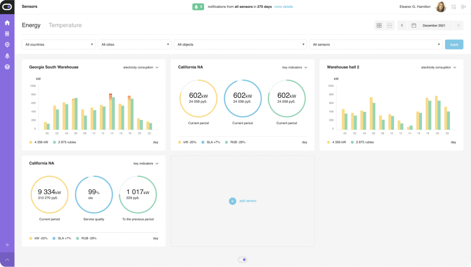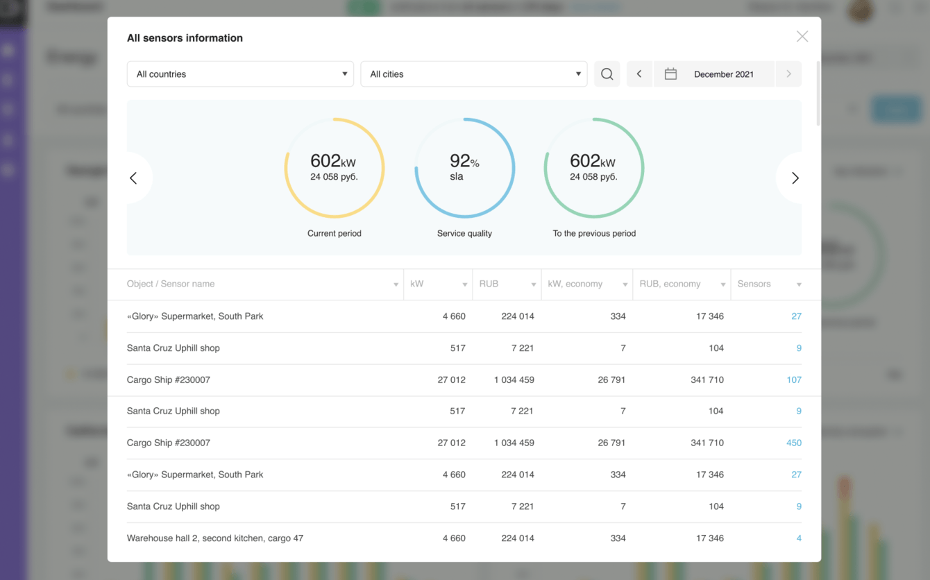 Это главная страница для пользователя. Здесь он видит все датчики и может фильтровать их по странам, городам, объекта и периоду. Например, можно отобразить датчики на складе в Сан-Франциско, вилле на Канарских островах или в московском магазине.