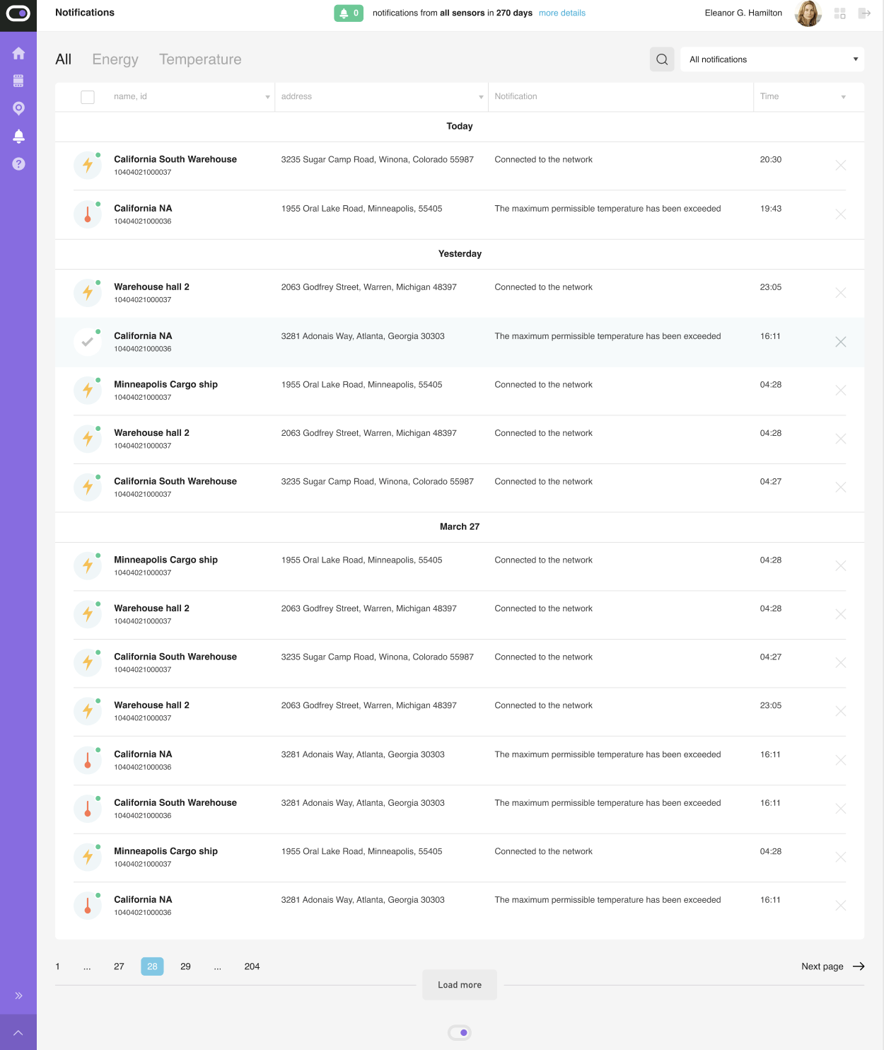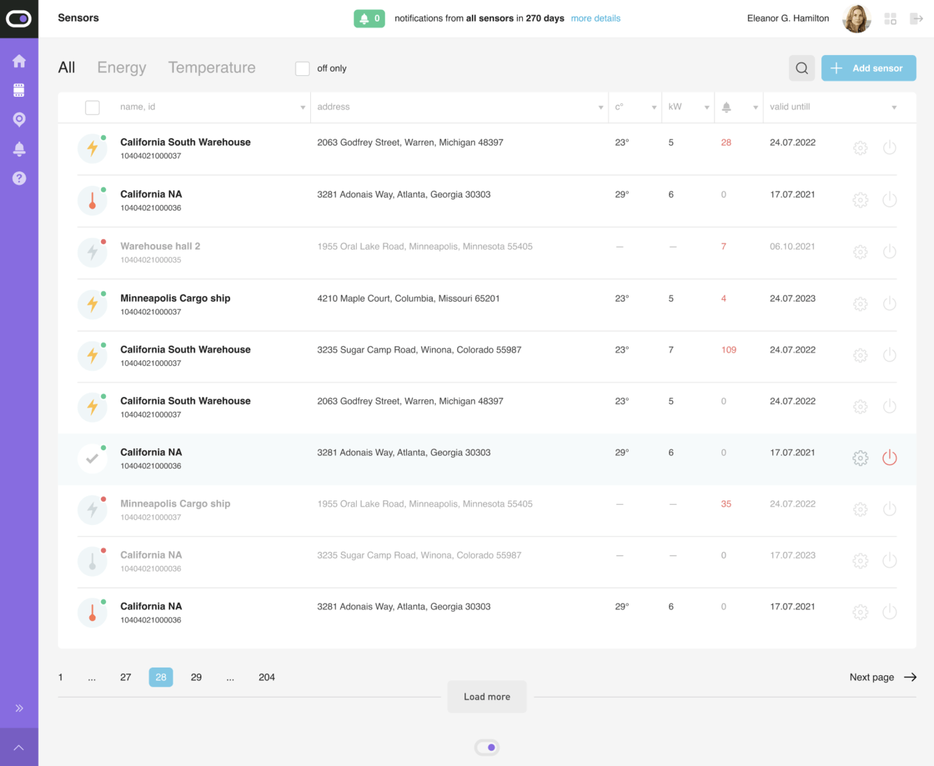 Каждый датчик промечен – мы сопроводили его всеми параметрами, которые позволяют пользователю отфильтровывать информацию и видеть лишь то, что ему нужно в данный момент. Например, на изображении выше датчик находится в Минессоте, он включен и потребляет заданный показатель киловатт. Все это позволяет пользователю в пару кликов увидеть всю информацию. Если же что-то пойдет не так, ему придет уведомление на указанную почту.
