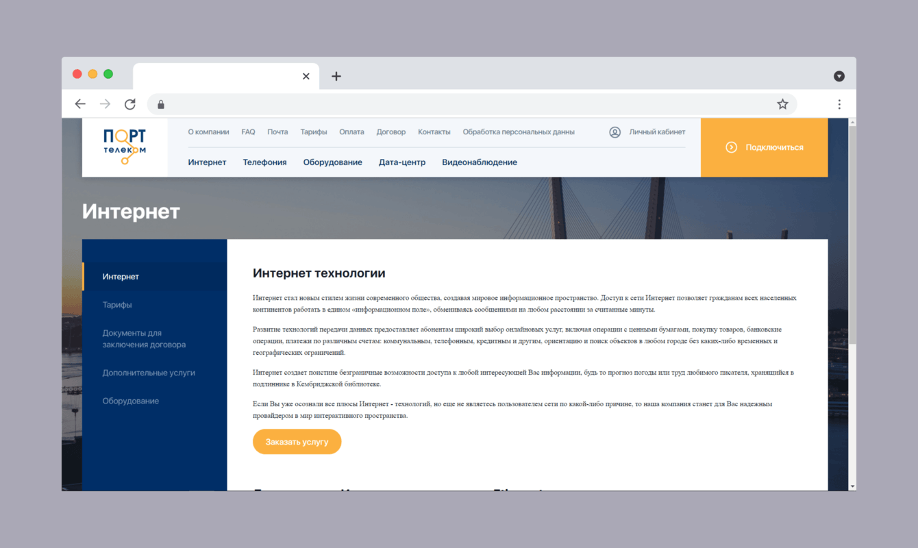 Ресурсы для телекоммуникационных компаний – наш конек. Корпоративный сайт «Порт Телекома» получился простым, понятным и с очень удобной структурой и навигацией. Пользователь сразу понимает структуру навигации и быстро находит необходимую информацию. Нет потери времени на понимание, куда нужно кликнуть, чтобы найти нужный раздел. Все отображается уже на первой странице.