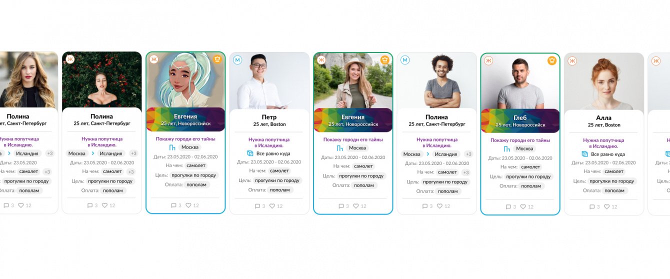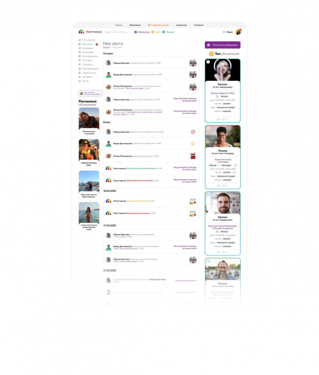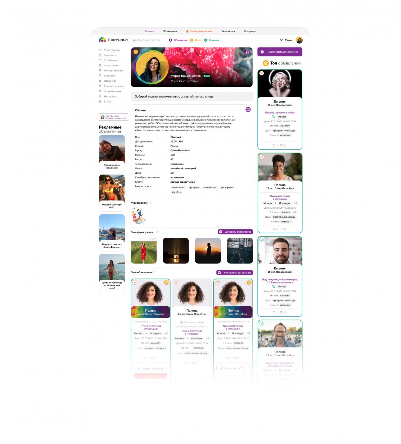 Зарегистрированный пользователь может размещать на портале объявления о поиске попутчиков. Объявление может содержать множество полезной информации, что поможет найти как можно больше близких по духу людей. На портале есть возможность платно разместить объявление в ТОПе.