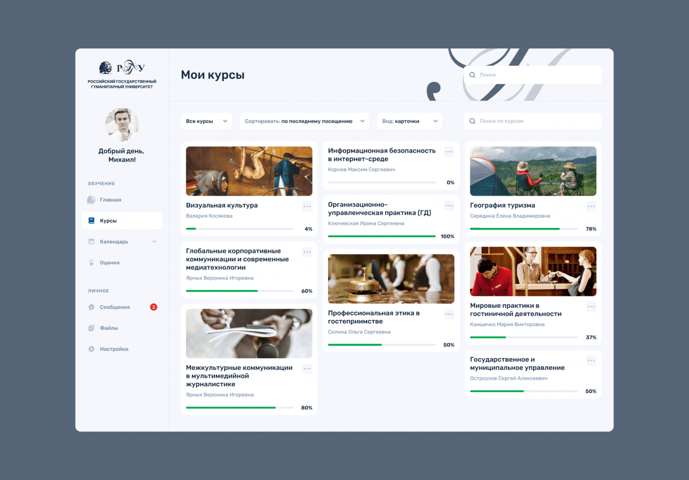 Обновленный дизайн должен быть визуально приятен, удобен при прохождении обучения, дружелюбен к пользователю, а также соответствовать общему визуальному стилю РГГУ.