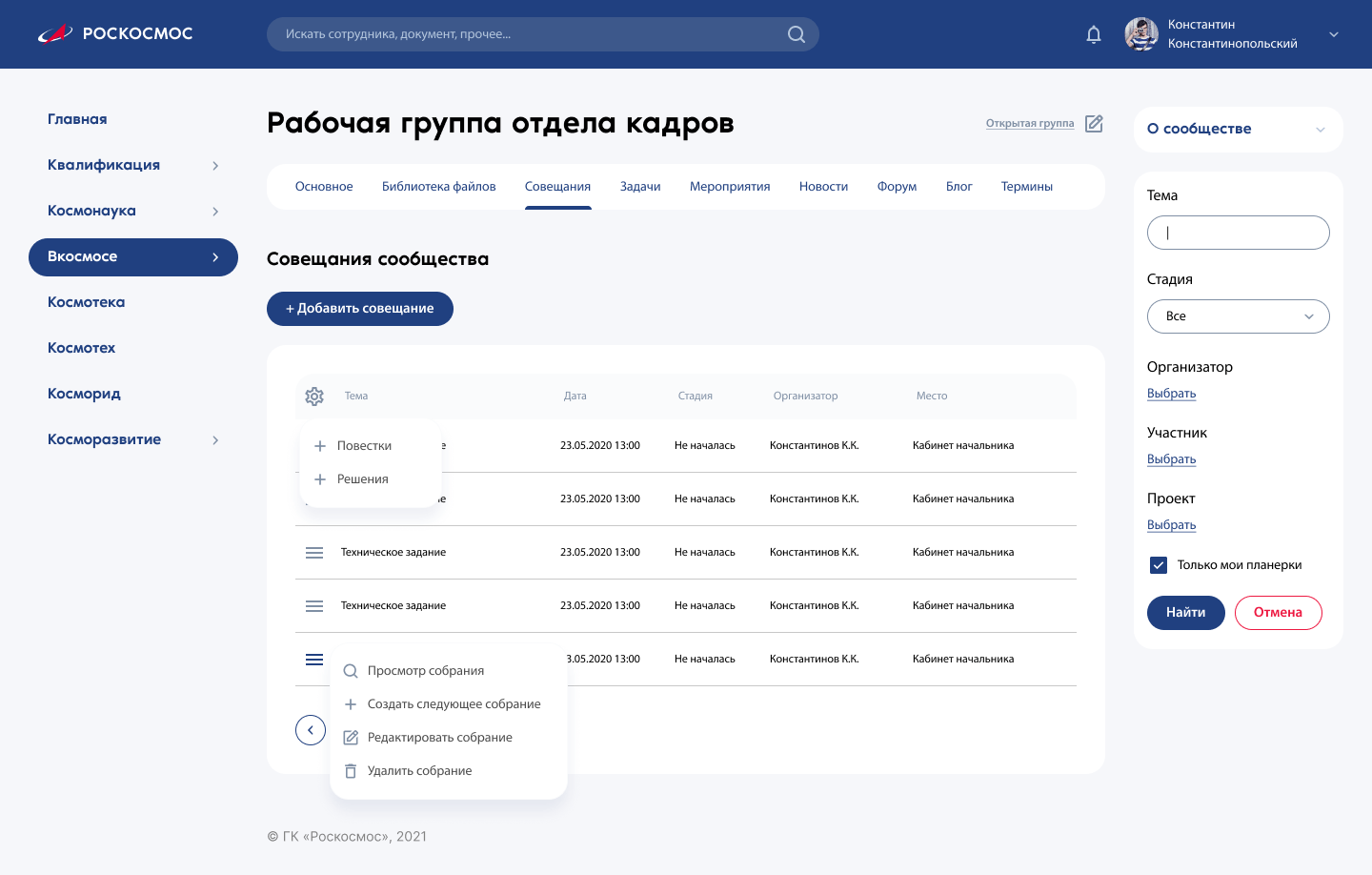 «Вкосмосе» — это система управления профессиональными сообществами. Иными словами, социальная сеть, где люди объединяются в группы по интересам и общаются между собой.