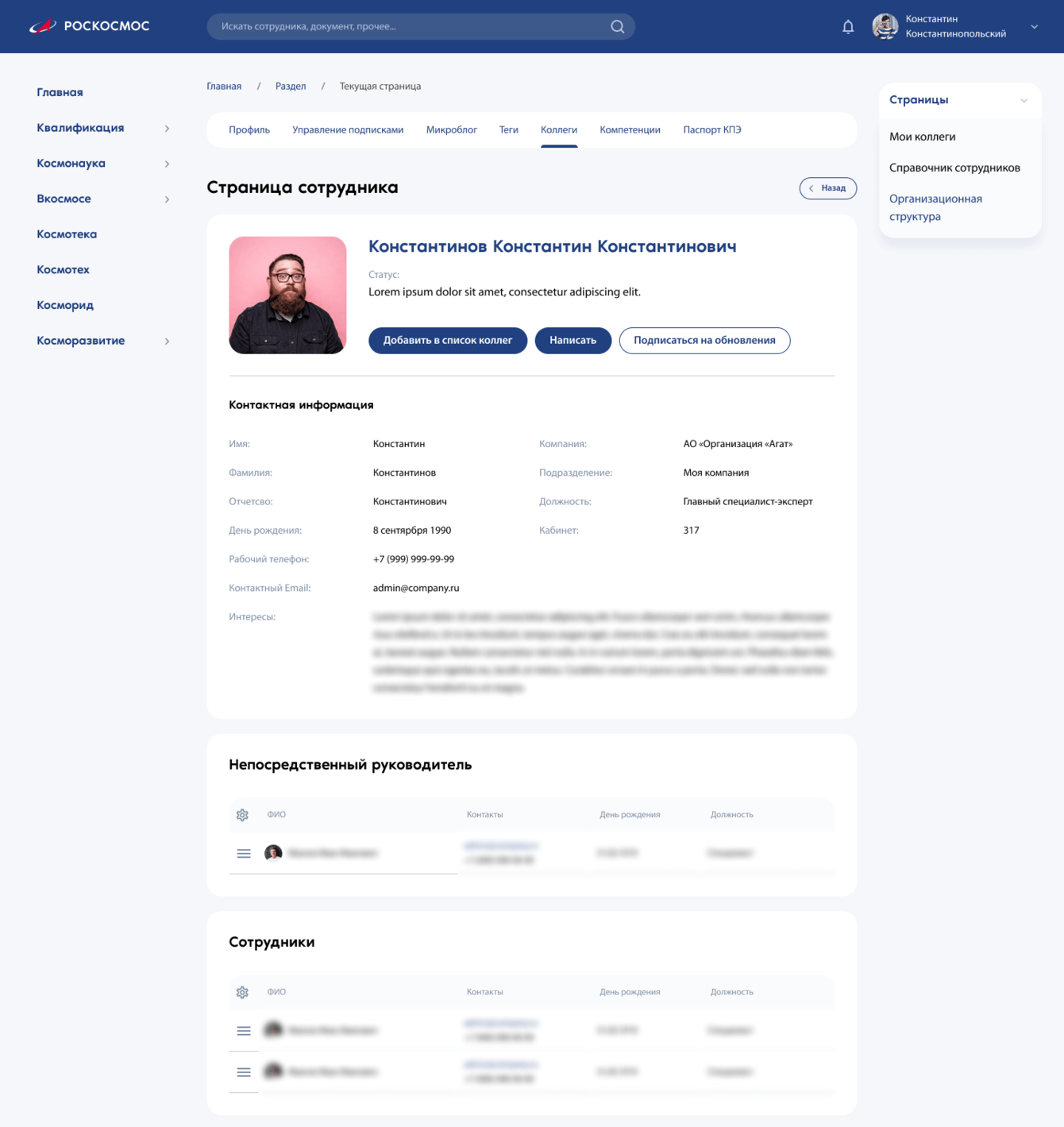 Мы доработали личный кабинет — теперь он похож на страницу в социальных сетях. Здесь сотрудники ведут микроблоги, управляют подписками и просматривают профили коллег.