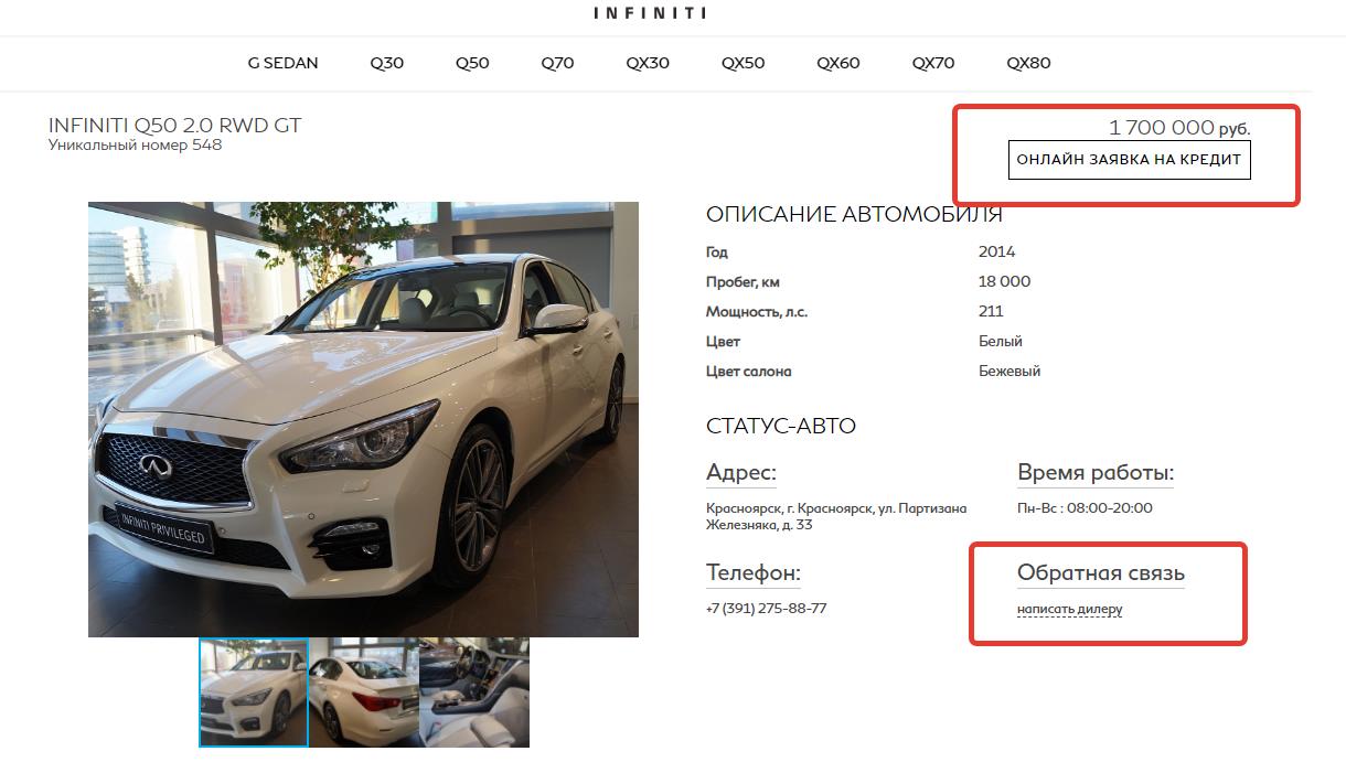 В карточке выбранного автомобиля Клиент может посмотреть фото, характеристики, контакты Дилера, подать заявку на кредит, а также направить запрос на обратный звонок Дилеру.