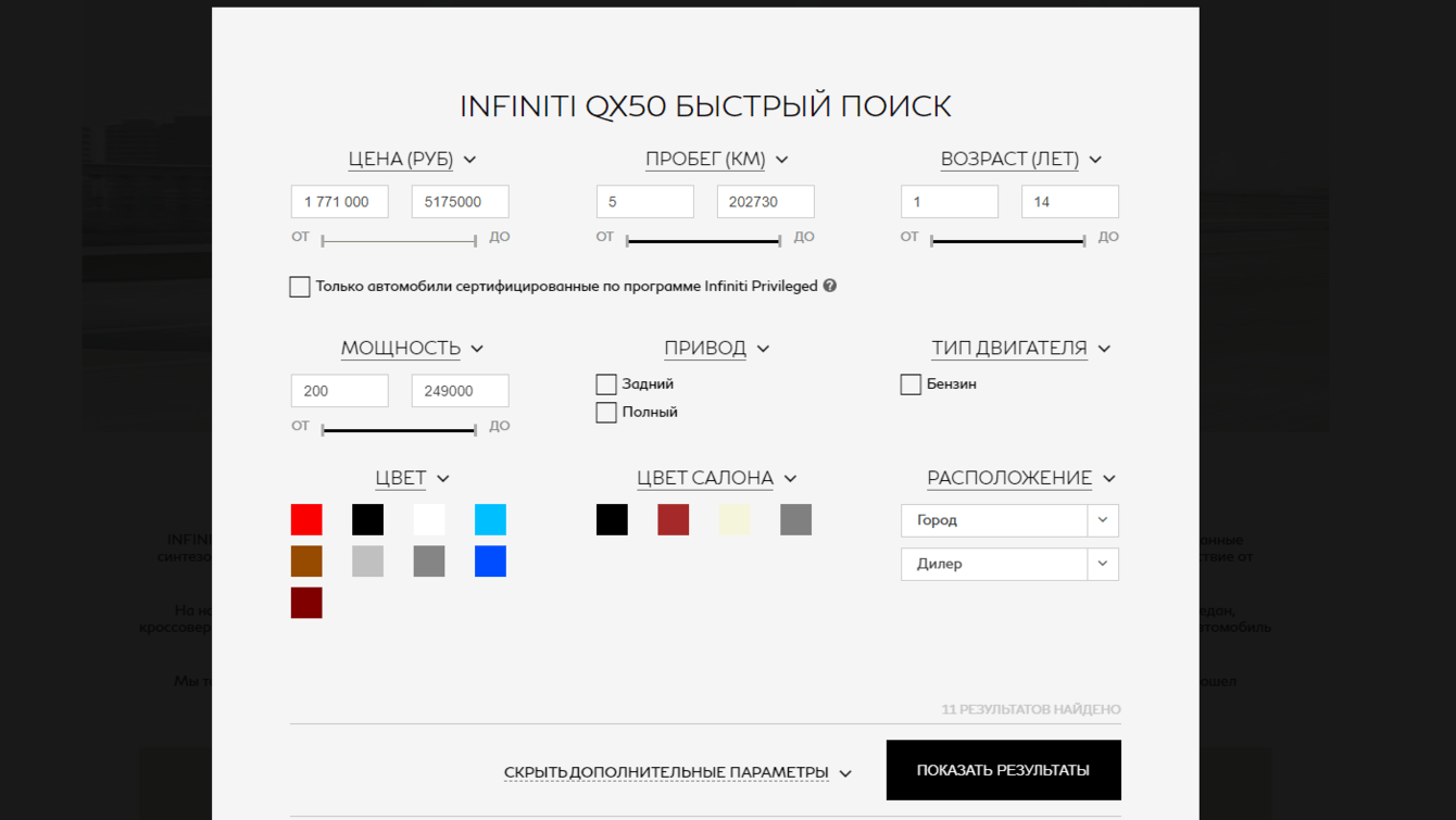 Используя фирменный брендбук INFINITI, а также проанализировав целевую аудиторию, мы разработали удобный поиск автомобилей INFINITI.